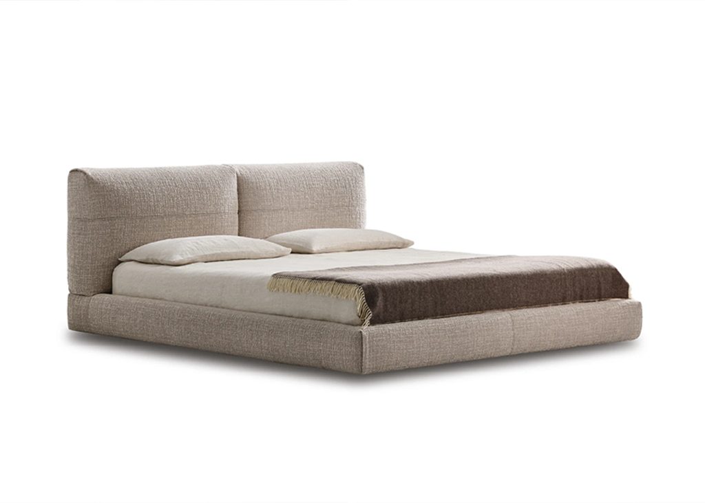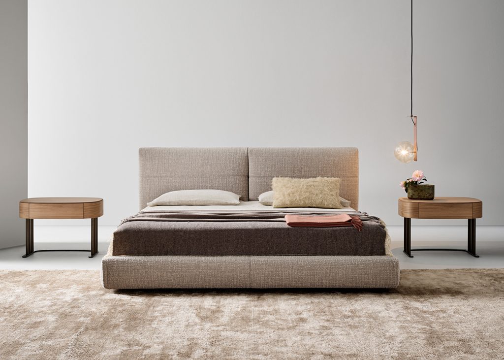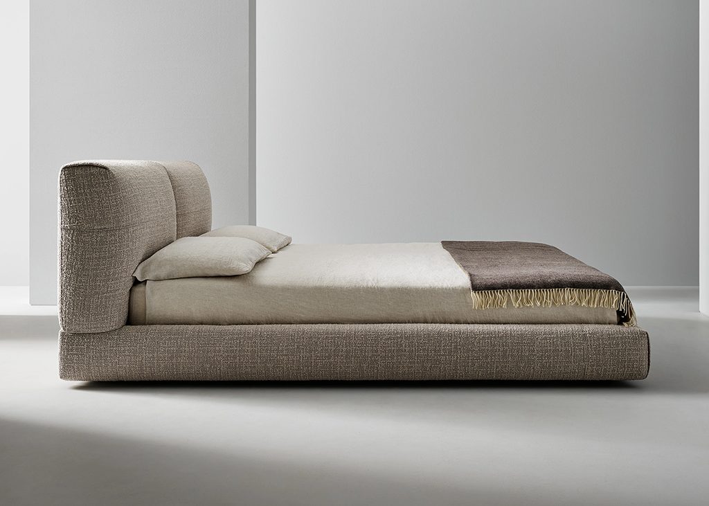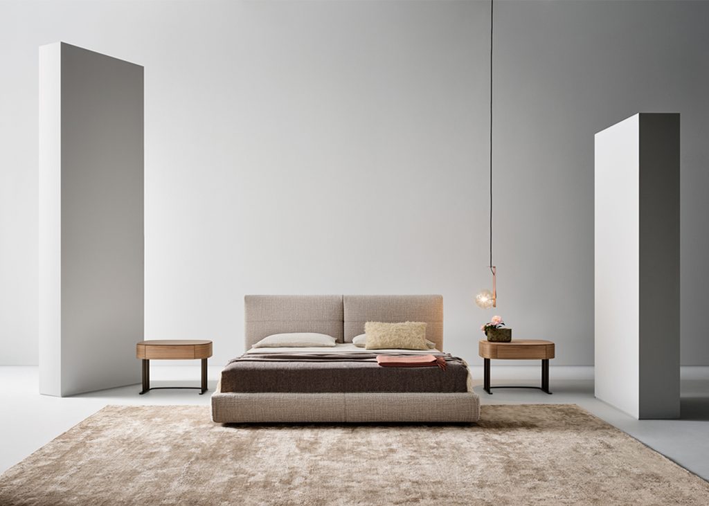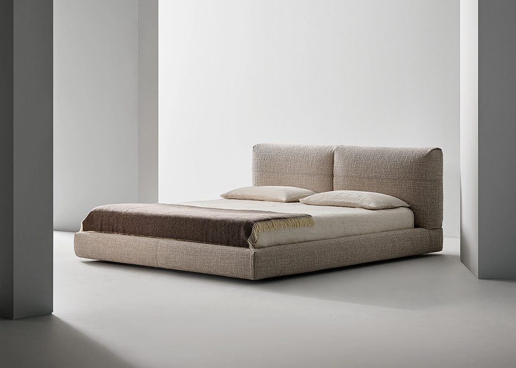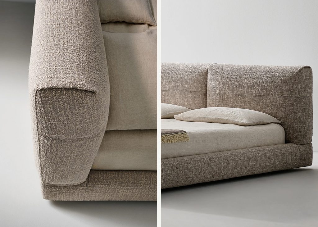 Belloalto bed brings to the bedroom a formal language defined by generous proportions and tailored detailing. The design is centred around the high headboard, conceived as a wide and comfortable support element. Its soft, slightly rounded lines emphasise a welcoming character, while the low bed frame, with its substantial thickness, reinforces the overall sense of visual solidity. Belloalto bed interprets the sleeping area through a soft and contemporary language, where generous proportions, material richness and tailoring come together to define a design of timeless elegance. A pronounced fold defines and enhances the two ends of both the headboard and the bed frame.