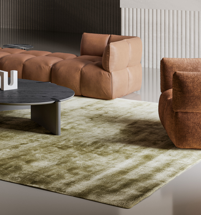 The padded top section is the same in both Belt and Cross, with no straight lines but only curved surfaces that gently complement each other, gracefully floating on their base. They are distinguished by their bases, which give each of them a distinct personality: the Belt pouf’s round metal base plays with the concept of stability, while Cross’ cross-shaped wooden base is the detail that makes this accessory immediately recognisable.