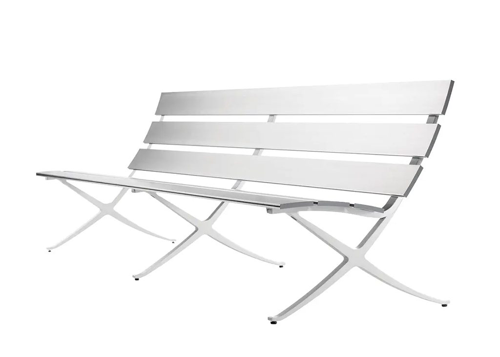 The Bench B is a multifunctional bench for indoor and outdoor use, reaching up to 4.8 metres in length. A bench that is made up of solid extruded aluminium lineal slats and cast aluminium legs.