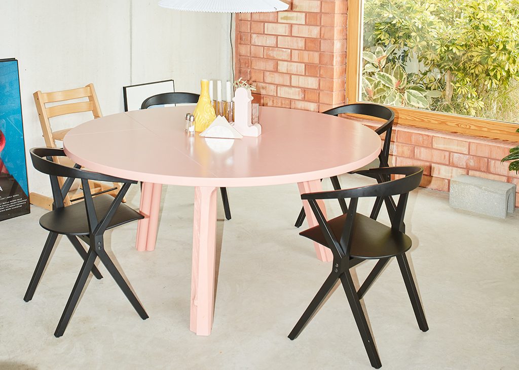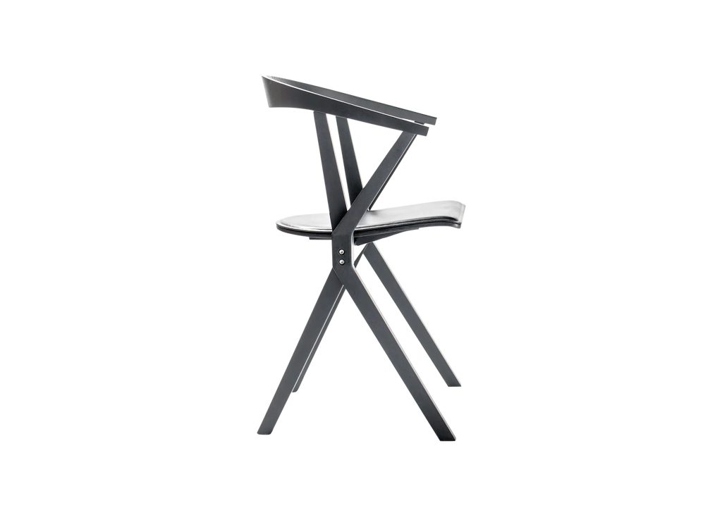 Sides and seat are in plywood and veneered in ash wood. Backrest in solid ash wood. Chairs are varnished in a natural finish or lacquered black. Tubular steel bottom structure with pieces in cast aluminium. Available in leather upholstered version.