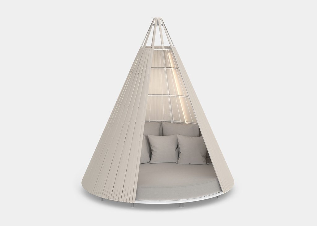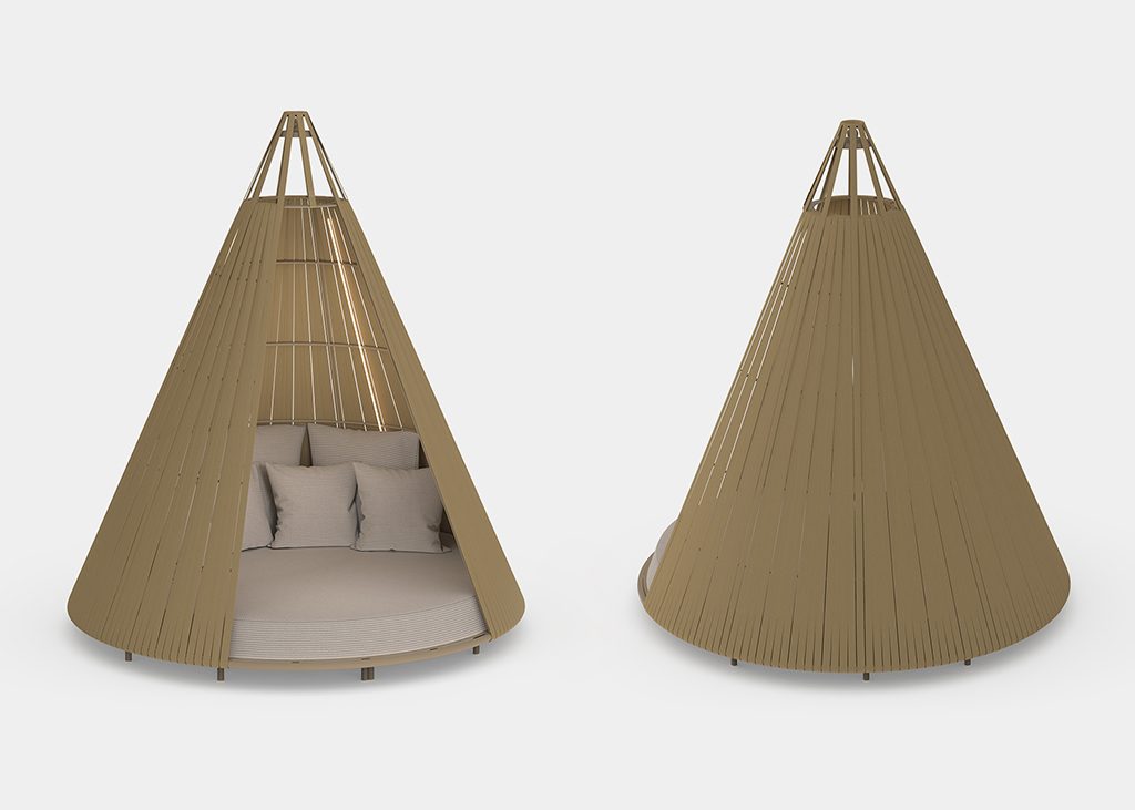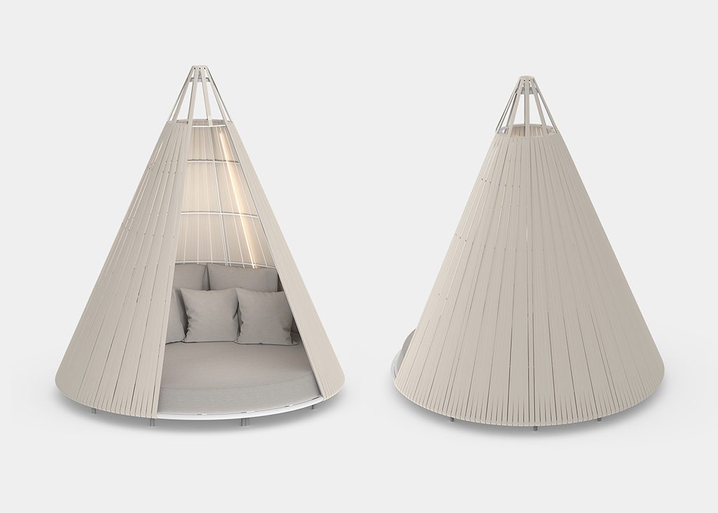 The concept of the CONO pergola was conceived as a project aimed at developing a unique product that would reflect Gandiablasco’s identity in a representative way. Hanging or above the ground, the CONO pergola is a unique and striking shelter reminiscent of teepees, and seamlessly blends with its natural surroundings. Created by José A. Gandía-Blasco Canales, it is part of GANDIABLASCO’s Outdoor Spaces collection.