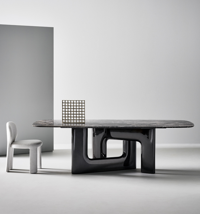 In the table Dorian, flexible qualities and geometric simplicity establish an interplay through contrast. The large top - made of ceramic, marble or wood - rests on a base with a striking sculptural character, consisting of an elegant and surprising elongated cylinder that recalls the shape of a Greek column and which pushes the design towards ancient architectural horizons.