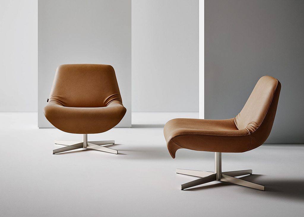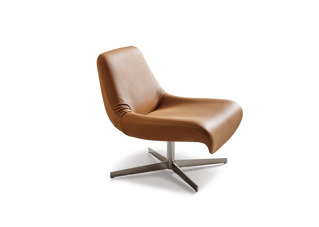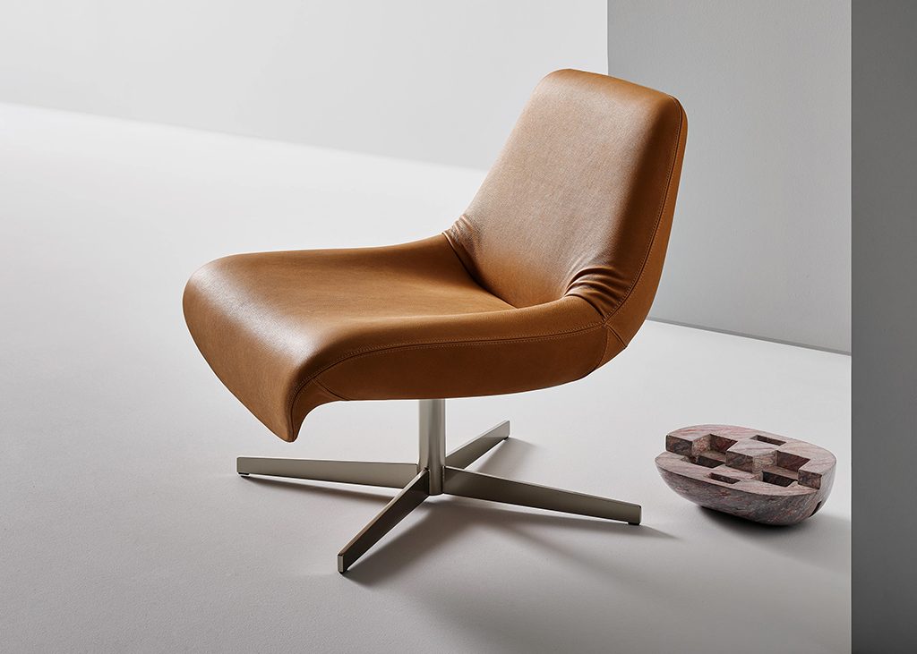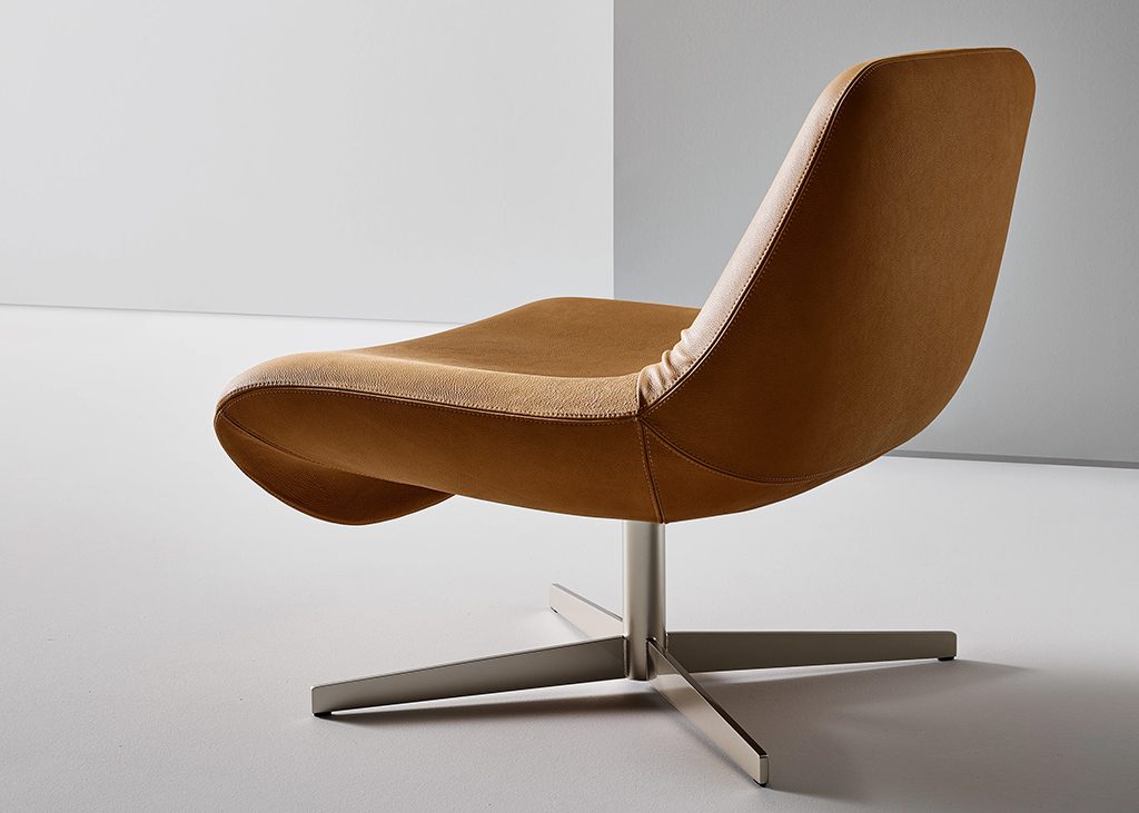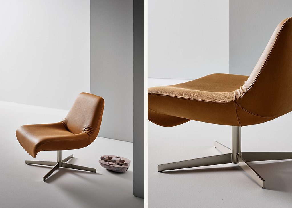 The Ellison armchair is defined by a single continuous line that shapes both the seat and the backrest. At the junction between these two elements, the upholstery adapts to the change in form, revealing a subtle lateral tension, a detail that lightens the volume and introduces a sense of immediate familiarity. It is an apparently irregular gesture that evokes the memory of traditional upholstery, making the form feel more approachable and lived-in, while preserving the clarity and contemporary character of the design. The four-spoke swivel metal base further enhances the armchair’s sense of lightness, creating a balanced relationship between the structure and the upholstered volume.