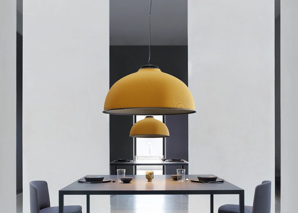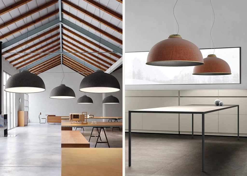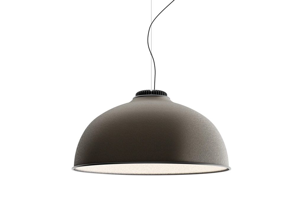 For the first time in the Luceplan catalogue, Farel introduces an iconic dome structure, a neutral geometric form proposed in sound-absorbing thermoformed material with outer fabric cladding. The lamp can be personalized thanks to a combination of colors of the shade, ranging through cool, warm and neutral tones for the outside, combined with dark or pale hues for the inside.
