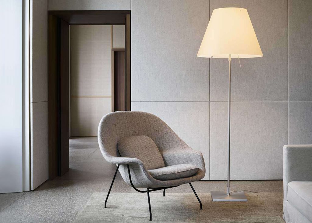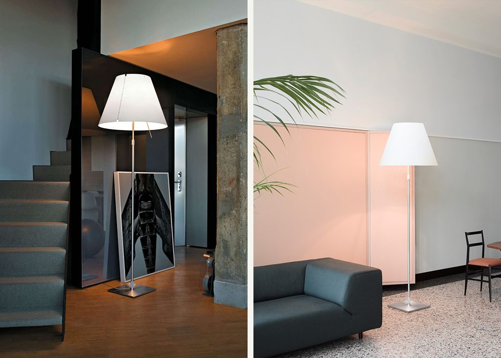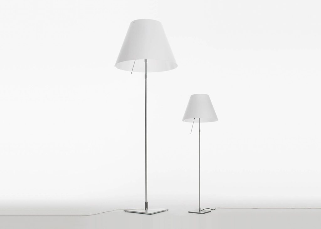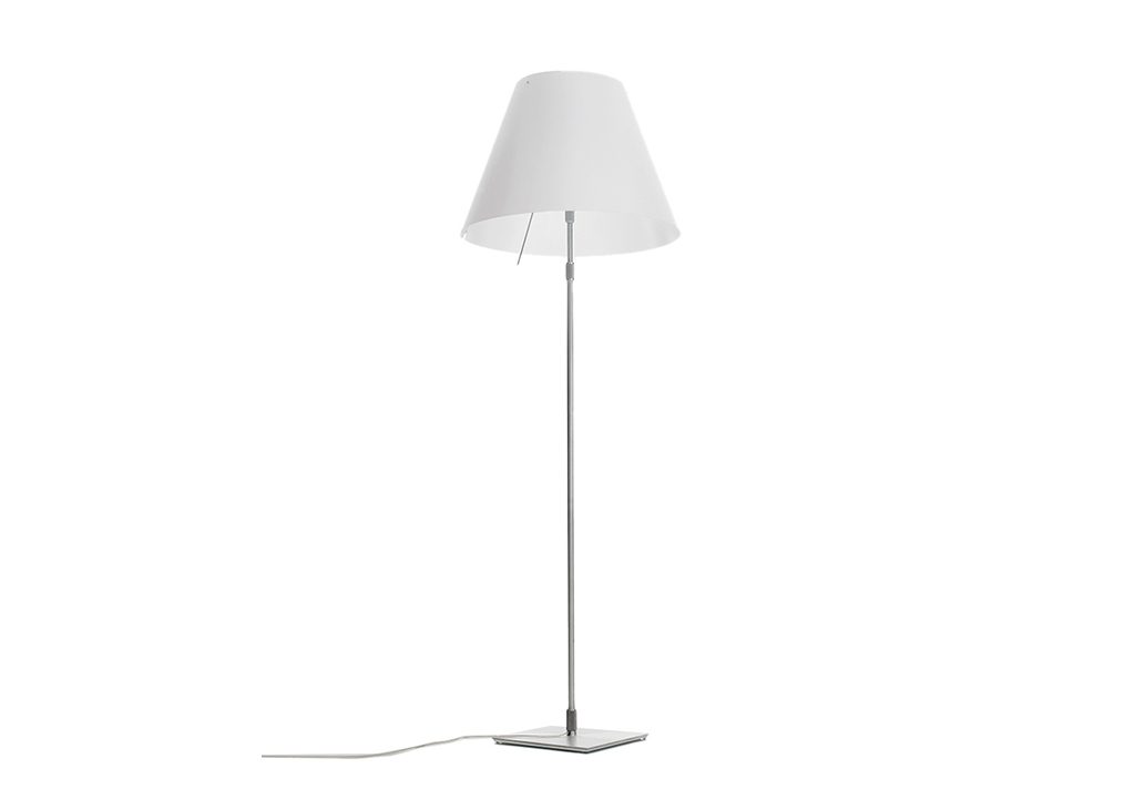 Tradition and innovation meet in this classic maxi floor model. The aluminium stem and polycarbonate lampshade enhance large spaces with lightness and luminosity for which this lamp is renowned. Also available in models with on/off or dimmer switch.