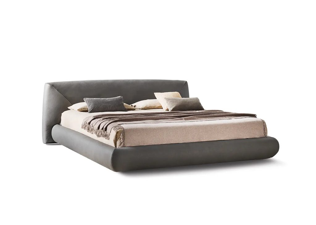 The Holden bed is defined by the meeting of two essential elements: a generously sized headboard and a low, compact bed frame that outlines the profile of the bed along its entire perimeter. The headboard is interrupted at the sides by an oblique cut that runs across the surface without breaking its continuity, a tailored detail that is simple yet visually distinctive. The bed frame appears as a full, rounded volume, continuous along the entire perimeter. The recessed feet lift the bed off the ground, preserving the compactness and balance of the design while introducing a pleasing sense of lightness.