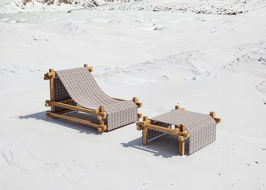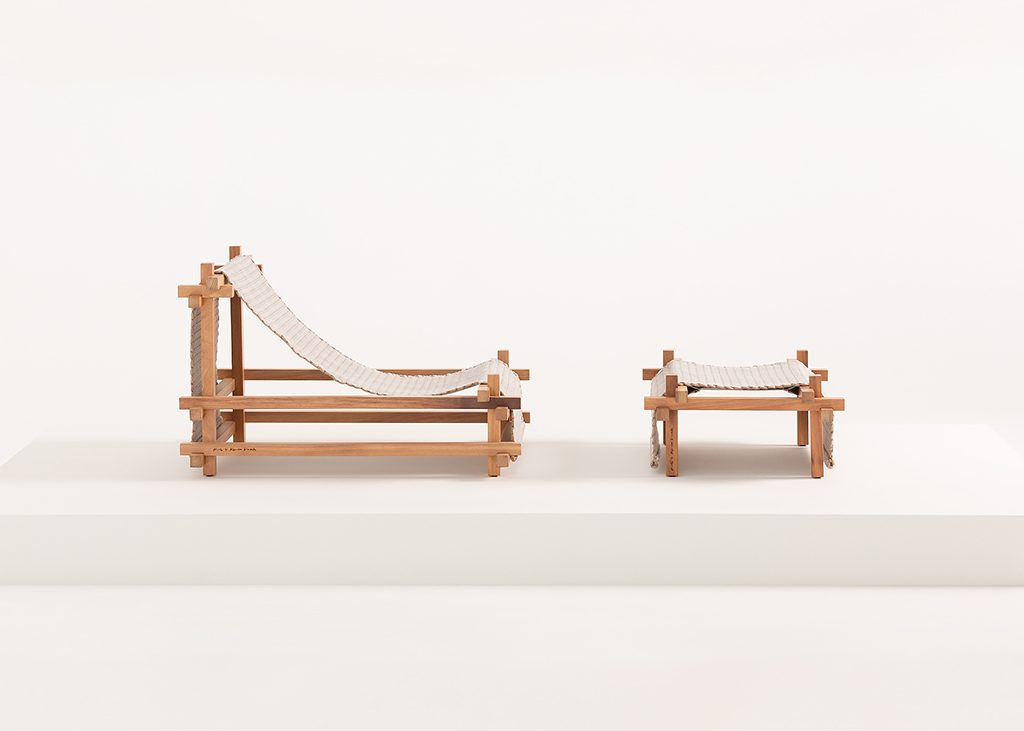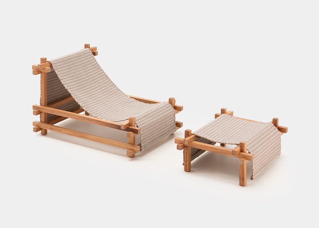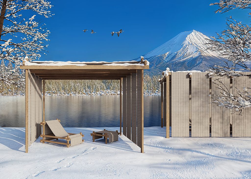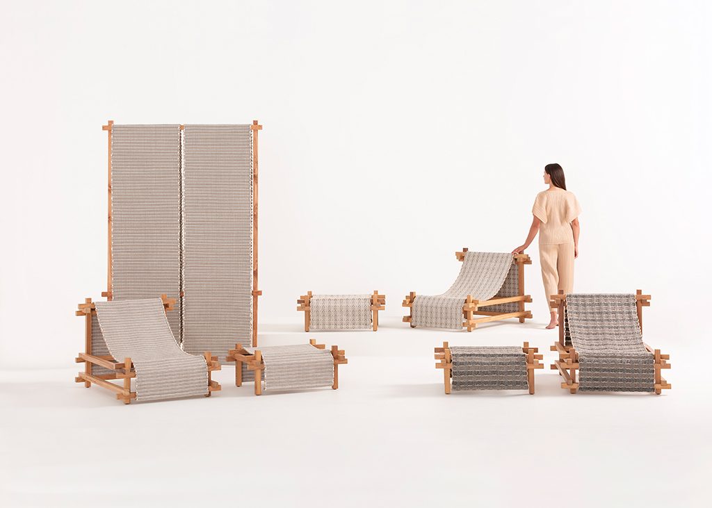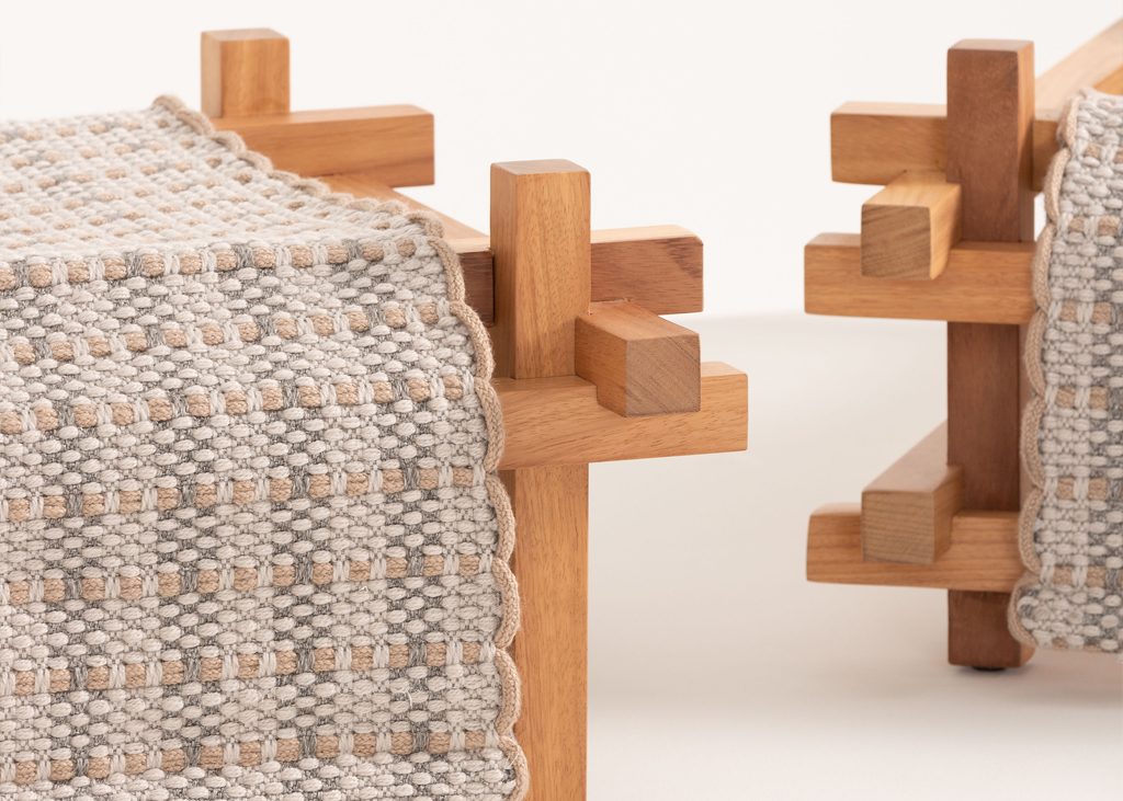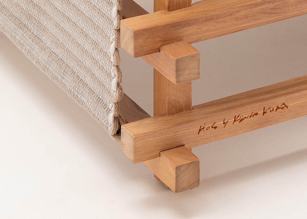 HOS is the first collection in the GANDIABLASCO Edition line, designed by Kengo Kuma for GANDIABLASCO. The design strongly evokes traditional Japanese architecture. The structure is built using Okiari, a carpentry technique that employs the interlocking of carved wood pieces, and pays homage to natural atmospheric phenomena like rain or mist, which are represented in its fabric.