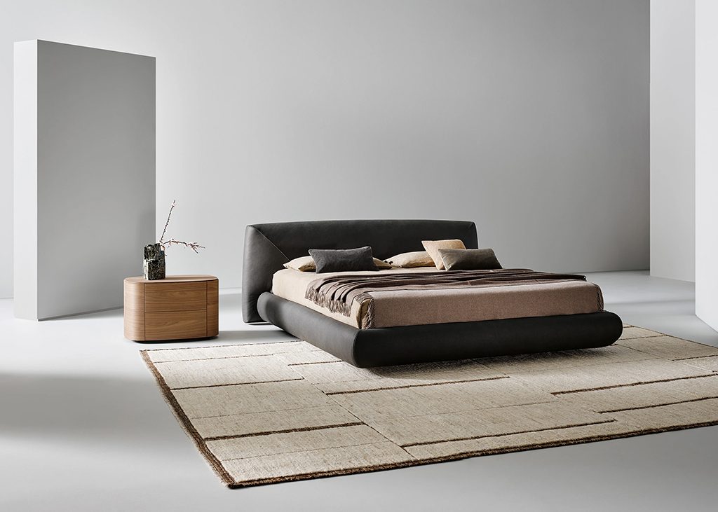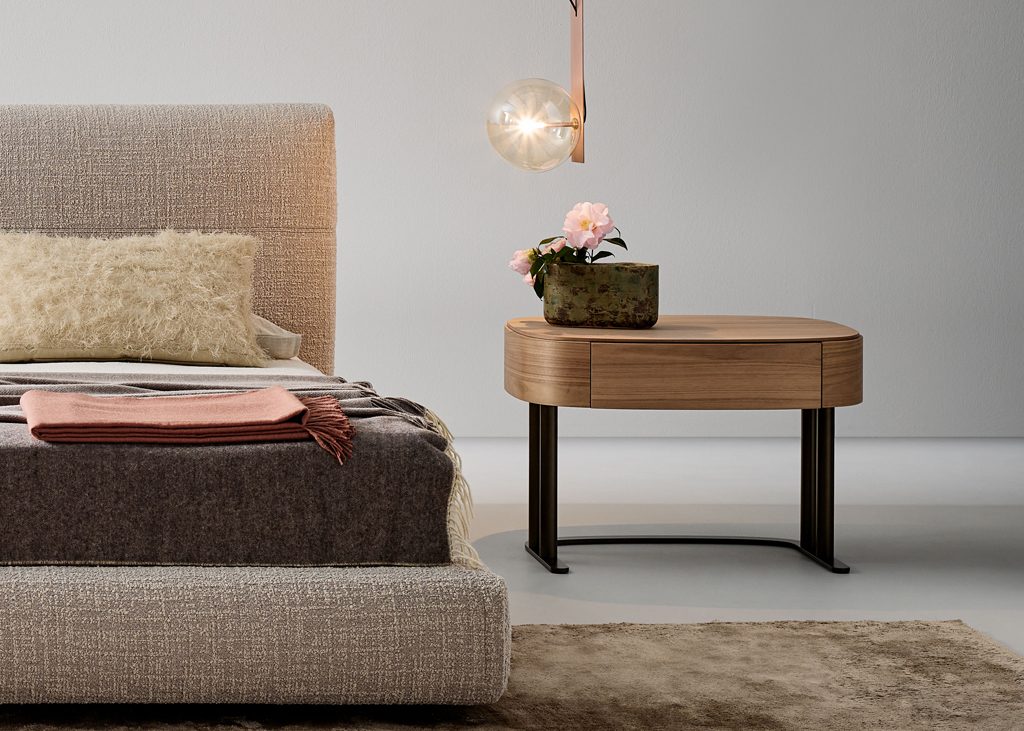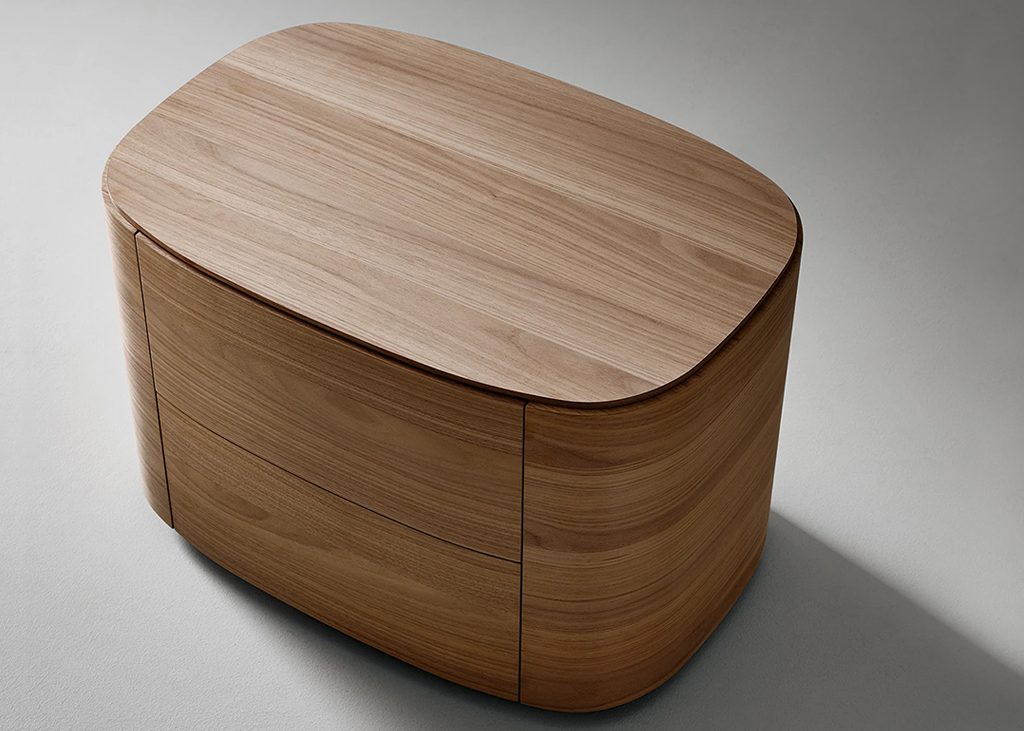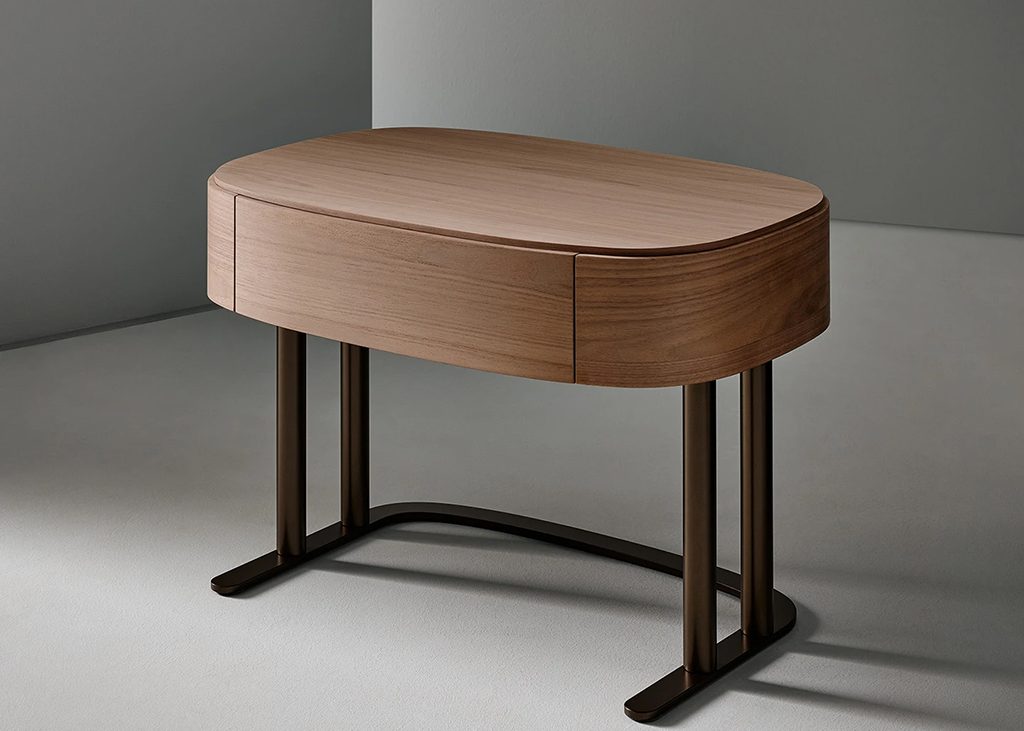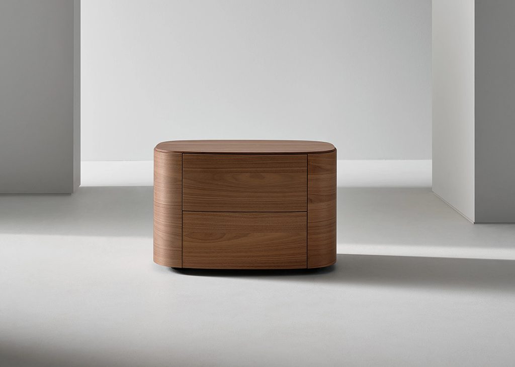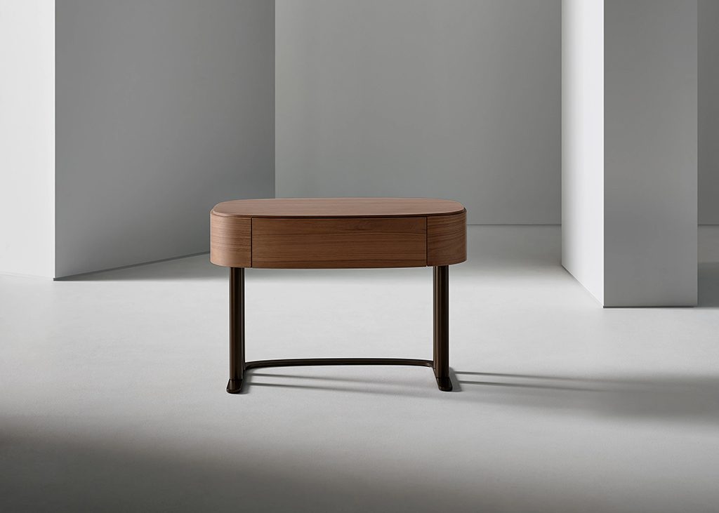 For the sleeping area, Gabriele and Oscar Buratti present the Isabey bedside table. The design is available in two versions, with one or two drawers, both featuring a rectangular top with rounded corners and the use of curved wood in Canaletto walnut, brown oak and charcoal oak finishes, tones that help create a warm and intimate atmosphere, particularly suited to the bedroom. The two versions are distinguished by the different relationship between volumes and the prominence of the base. In the two-drawer version, the volume is solid and offers greater storage capacity. In the one-drawer version, the metal base becomes more prominent, composed of two closely positioned tubular elements that recall the paired column of classical architecture.
