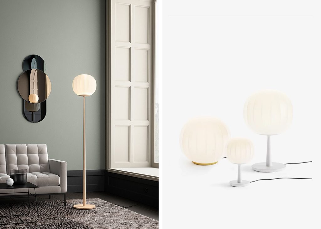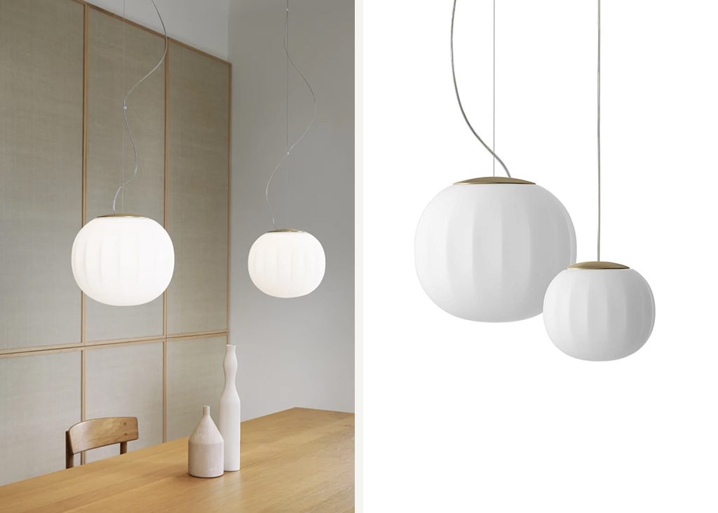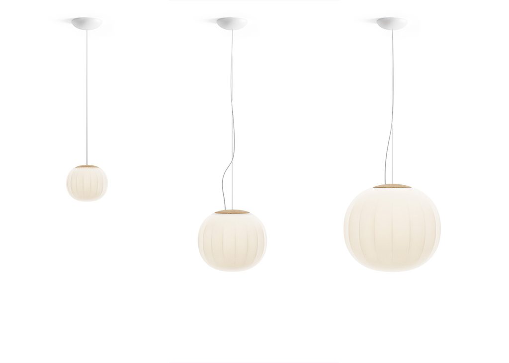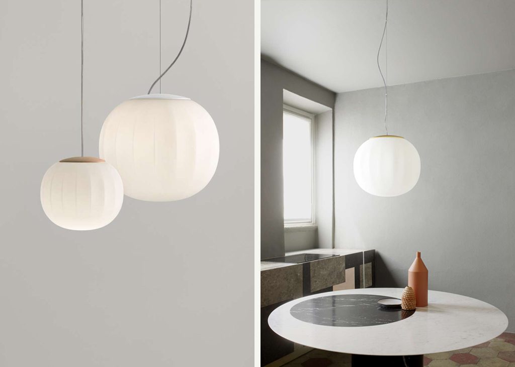 The diffuser in opaline blown glass – whose surface is scanned by the repetition of slight vertical cusps that vanish at the extremities – is combined with a wooden structure, making Lita a product with a forceful material character. A timeless and evocative object that combines the crafts tradition with technical research, seductive in its way of matching visual and tactile sensations.