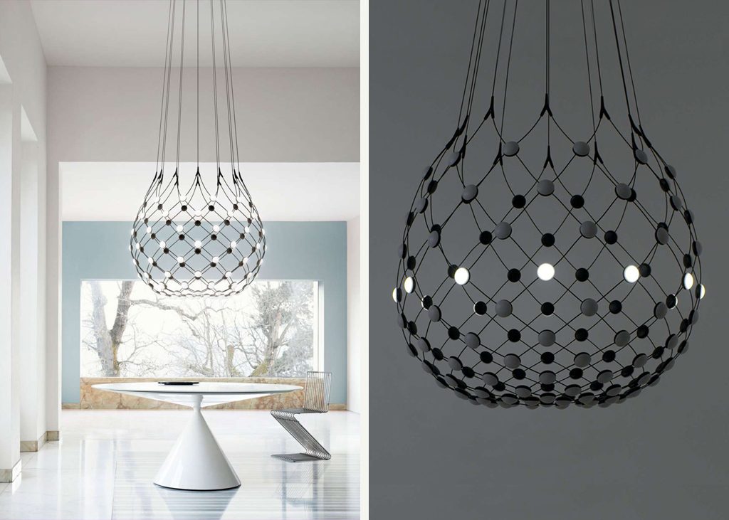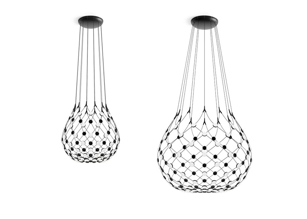 The wireless version of Mesh offer users total freedom of lighting control. Available for the suspension versions large (Ø 100) and medium (Ø 80), Mesh Wireless is equipped with a sophisticated electronic board allowing users to interact with the lamp by means of a smart device. Luceplan has developed a special App (for iOS and Android) that makes it possible to control single or multiple units, individually or as a group. The Nesh App permits use of one or more light points at a time, orienting light in space to create different moods and experiences. The App can be programmed with 6 presets for rapid activation. It is also possible to set up a dynamic scenario with a simple touch of the screen. Using a local Internet connection, on-off functions can be programmed in remote access mode.