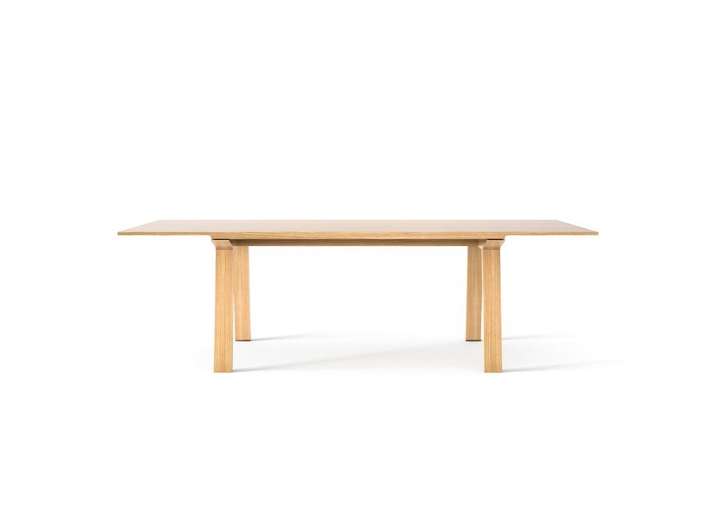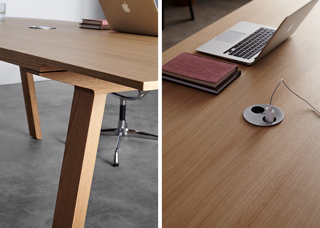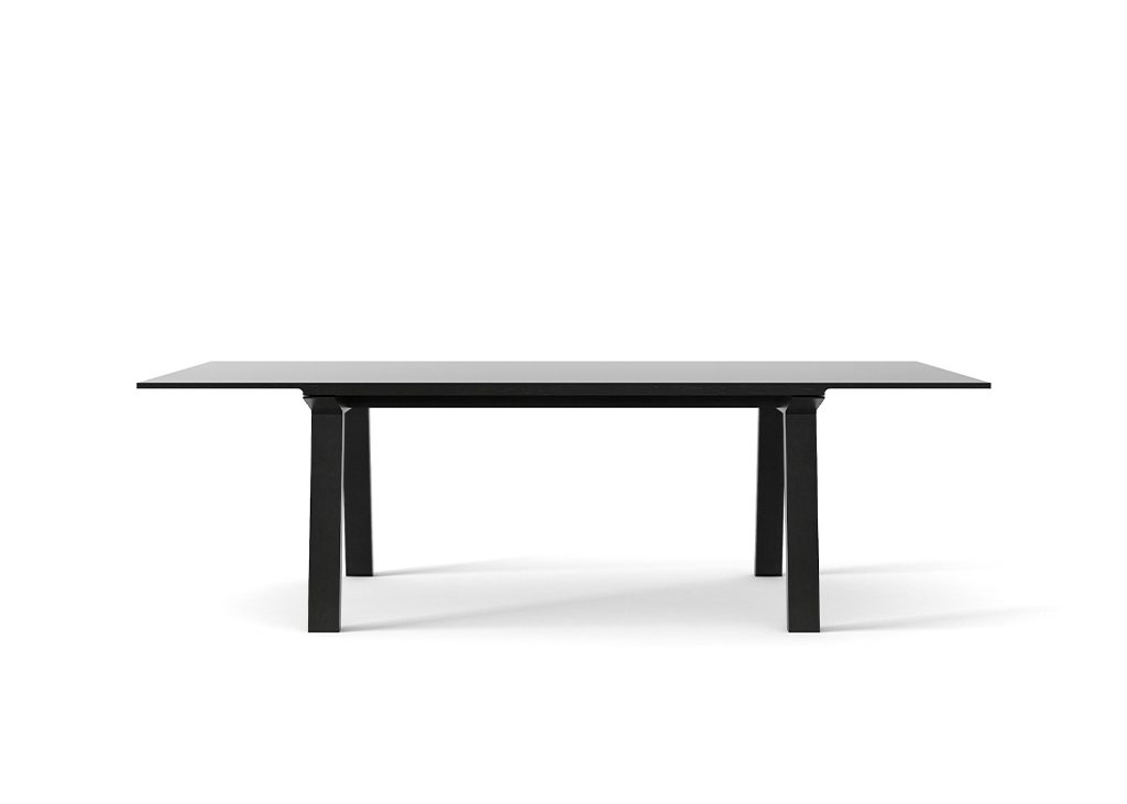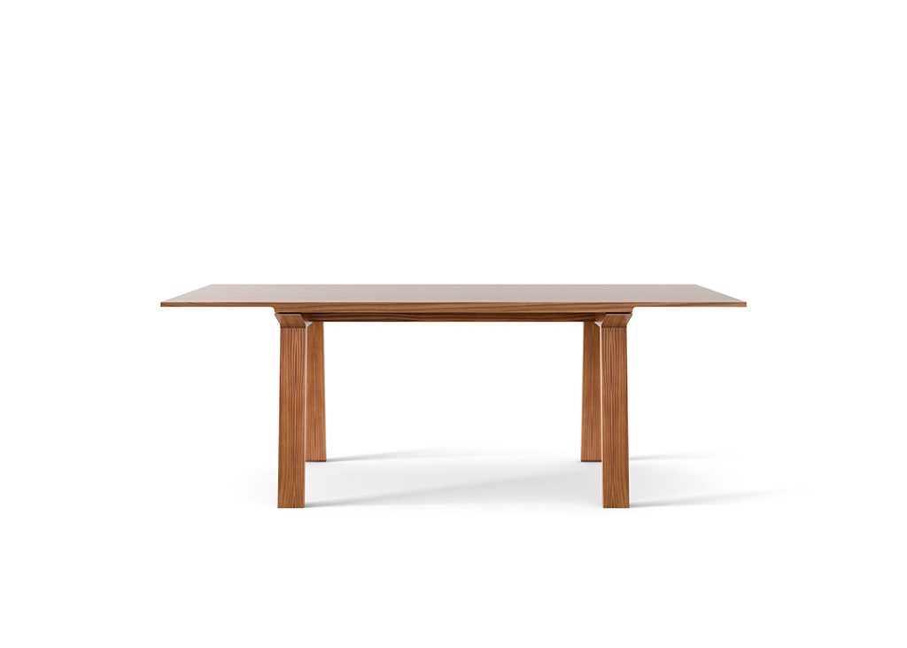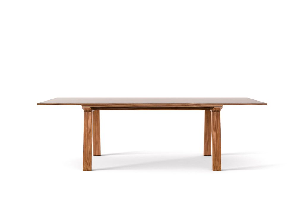 A collection of tables with a solid appearance and exquisite detail both in the tabletop and in the trestle-like grooved legs. Table supported by adjustable feet.