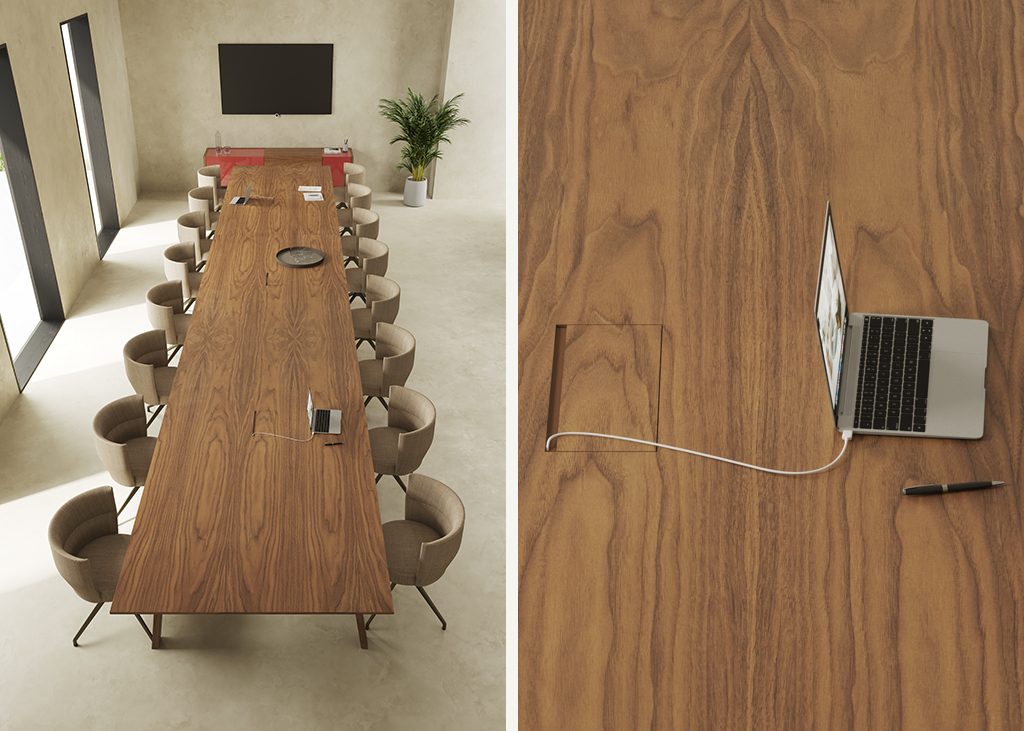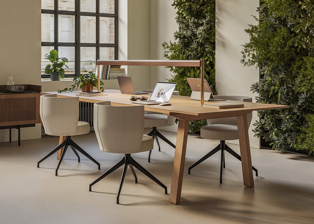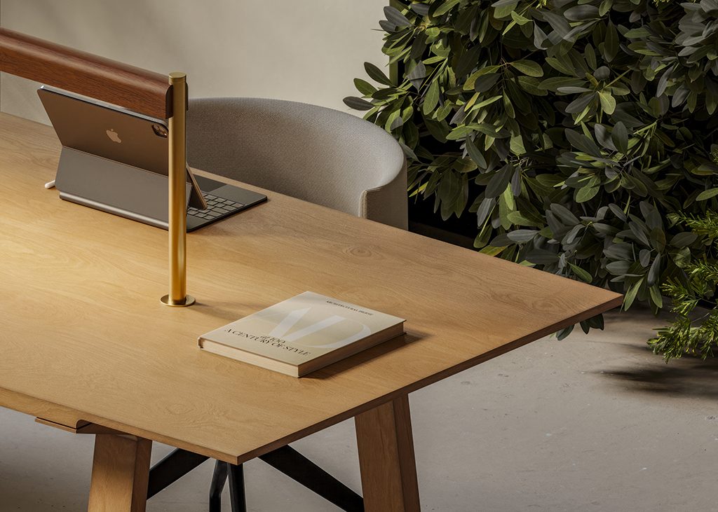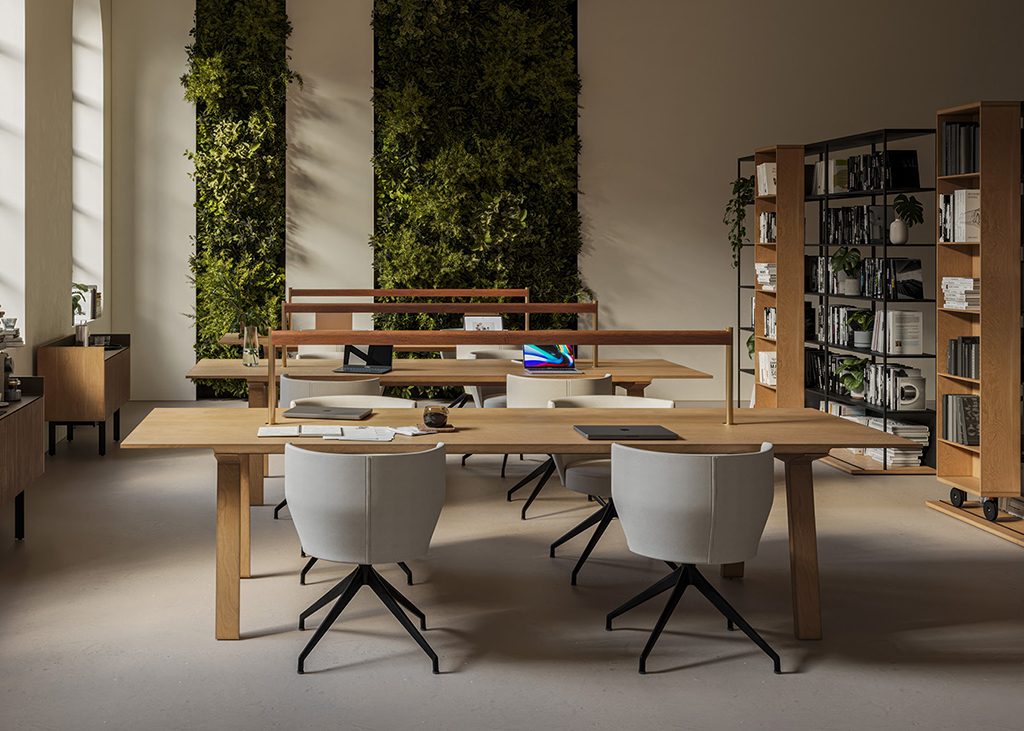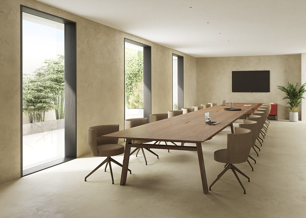 A collection of tables with a solid appearance and exquisite detail both in the tabletop and in the trestle-like grooved legs. Table supported by adjustable feet.