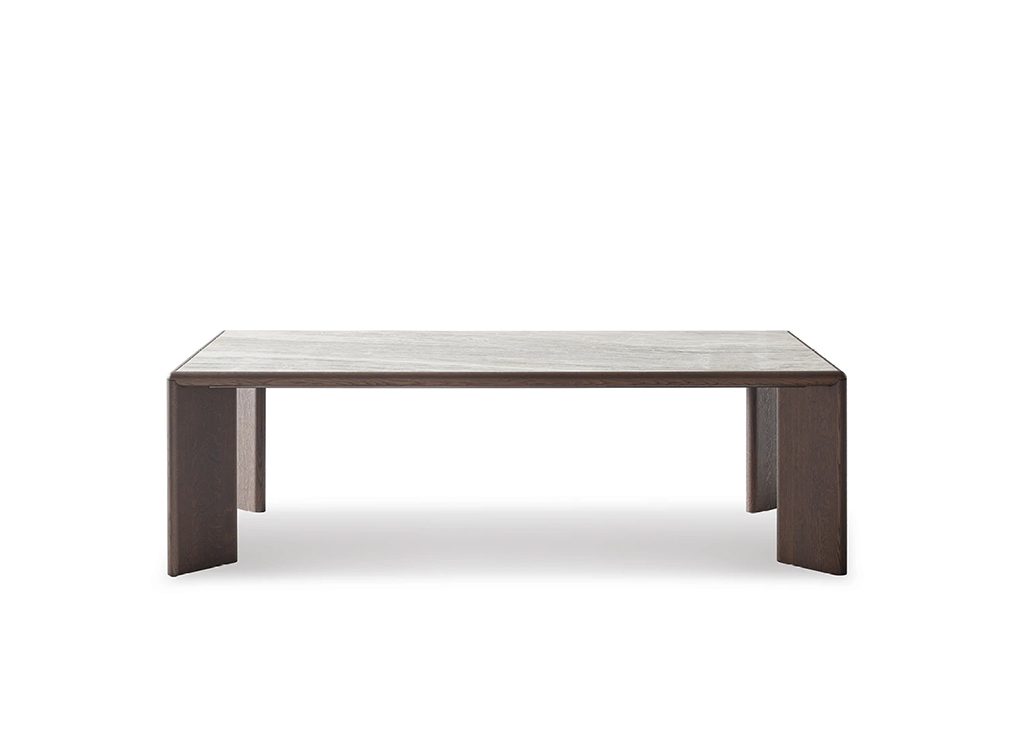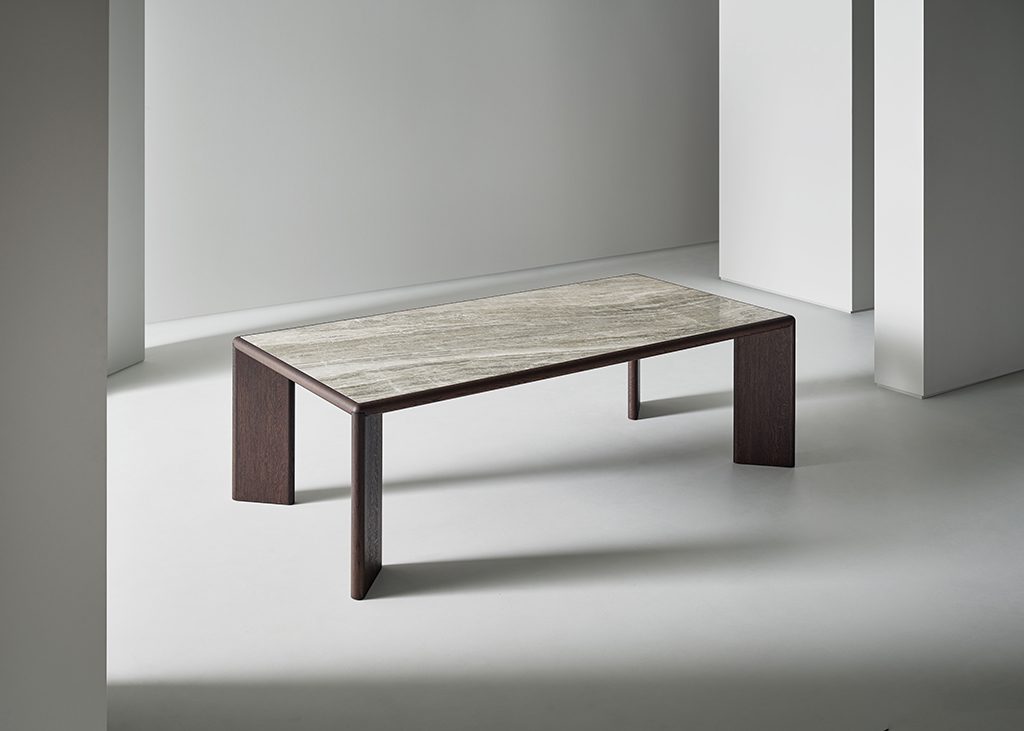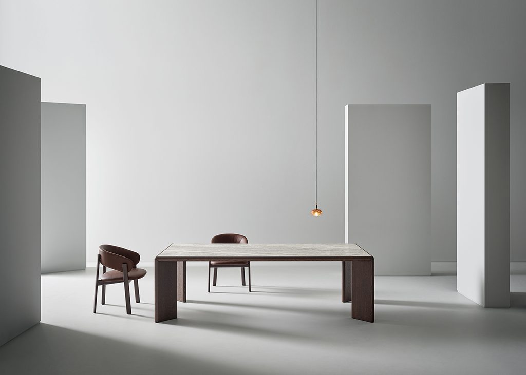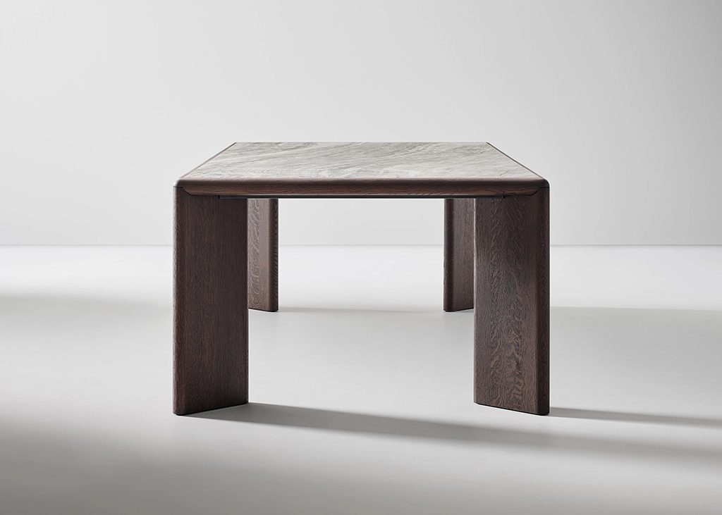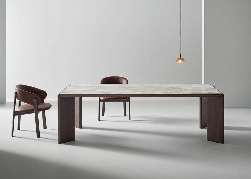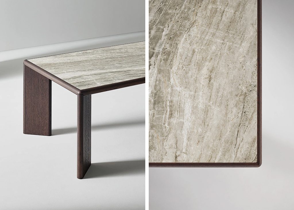 Materials take centre stage in the Oshi table: solid wood defines the legs and the edge, which runs along the entire perimeter of the top, creating a continuous design, while ceramic or glass completes the surface in a balanced material composition. The design, distinguished by legs positioned at 45° at the corners, is characterised by soft profiles that become the common thread running through all elements. Its generous proportions and the craftsmanship of the wood lend Oshi a strong, authoritative presence, expressing a reinterpreted archetype in a contemporary key. For this reason, Oshi fits naturally into dining environments where the table plays a central role, as well as into more representative settings such as meeting rooms or prestigious spaces.
