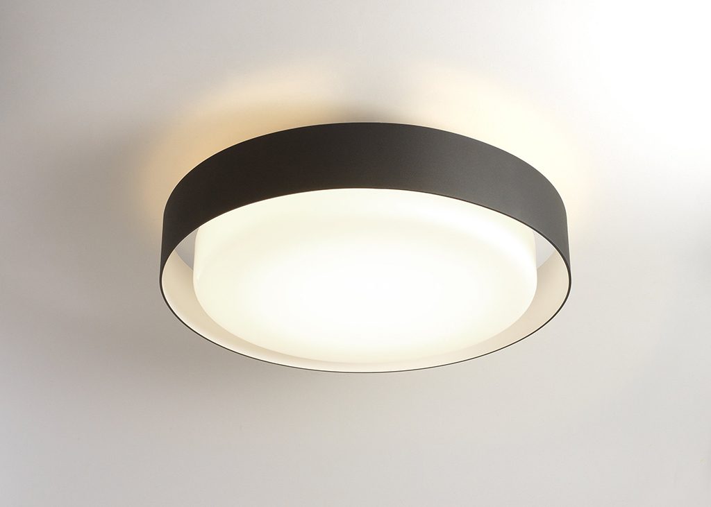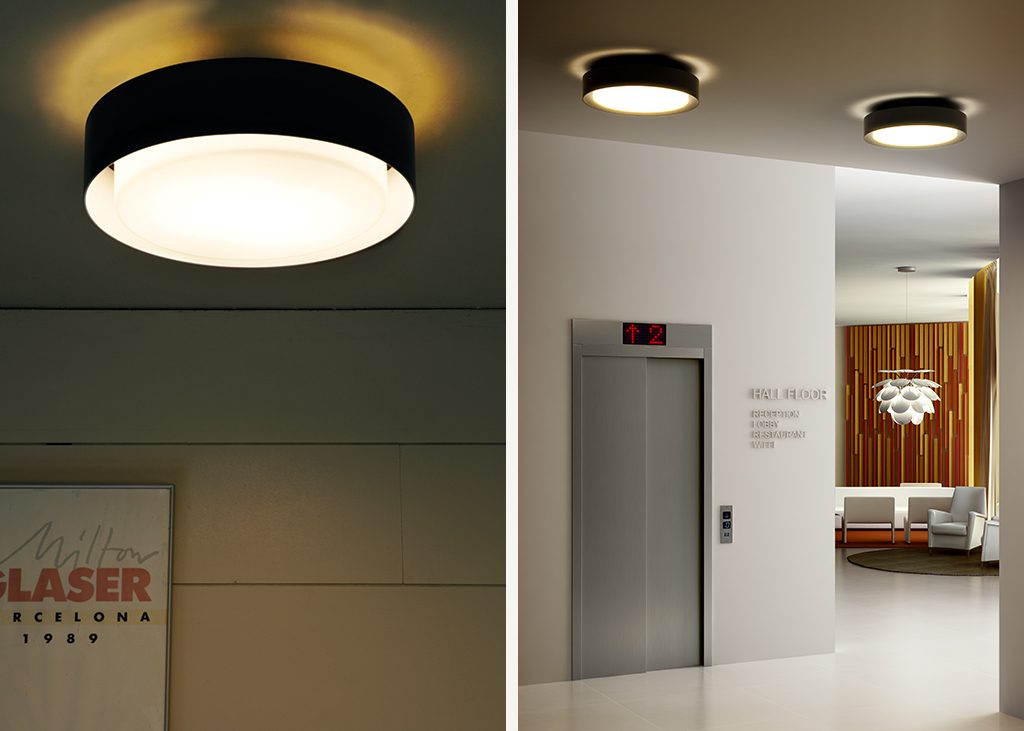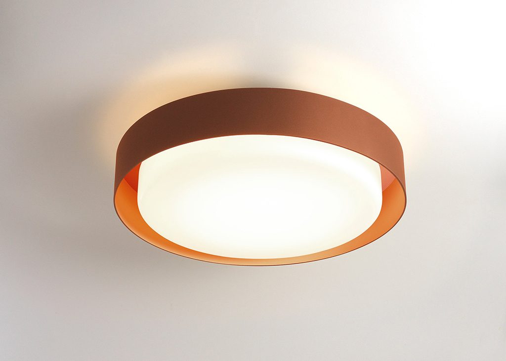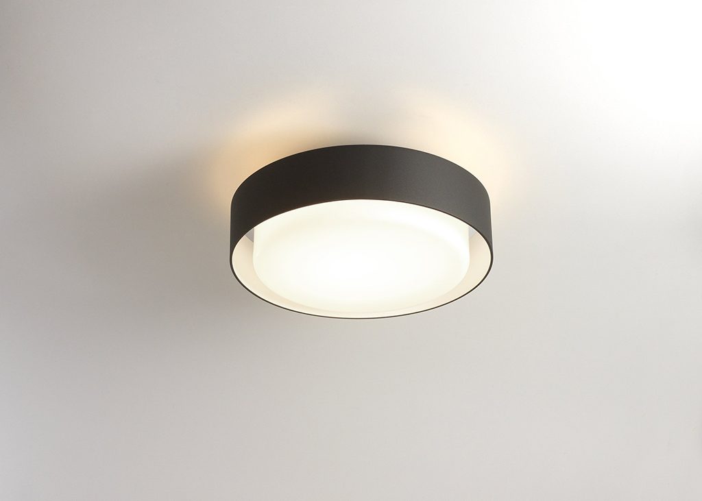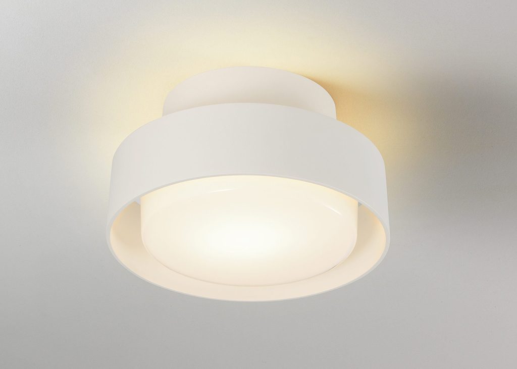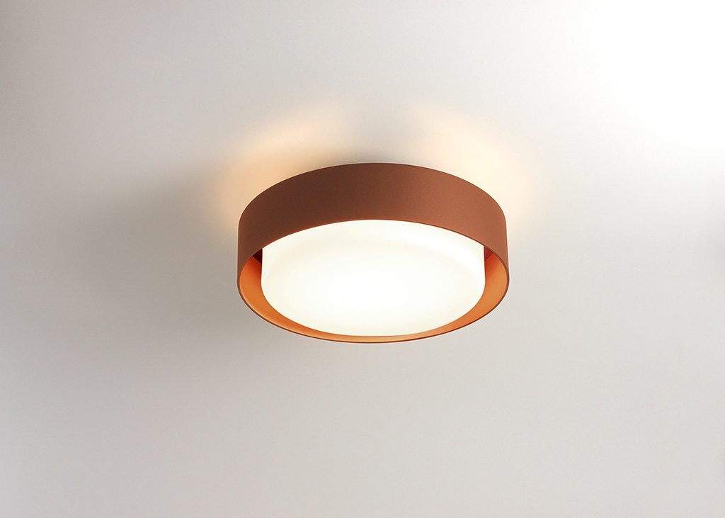 A ceiling lamp whose beauty lies in its simplicity and clarity, at the same time as offering multiple lighting effects thanks to its design. The structure around the diffuser in blown white glass is set slightly apart from the ceiling, and filters the light upwards creating a glowing halo. Available in three diameters, it can also be used as a wall fixture.