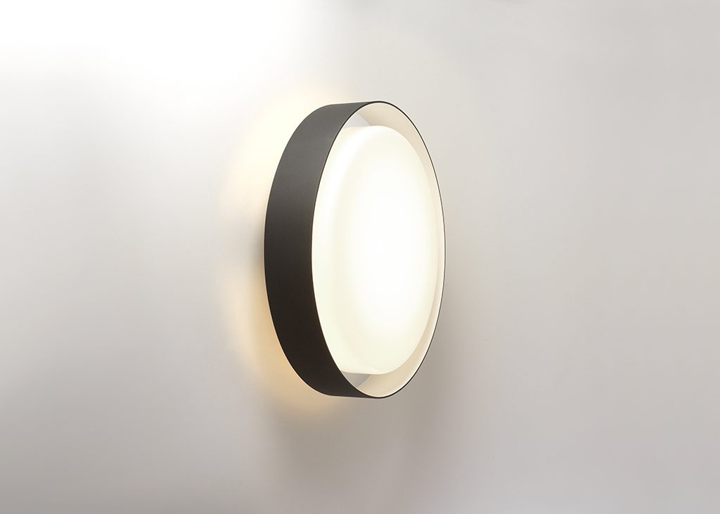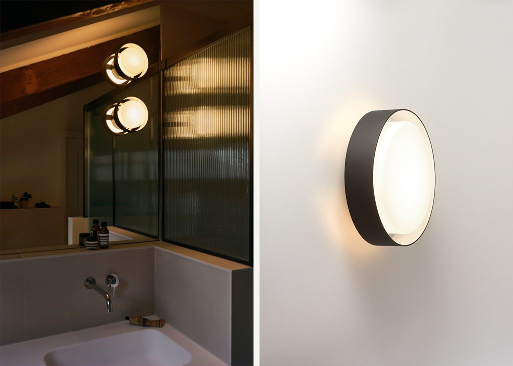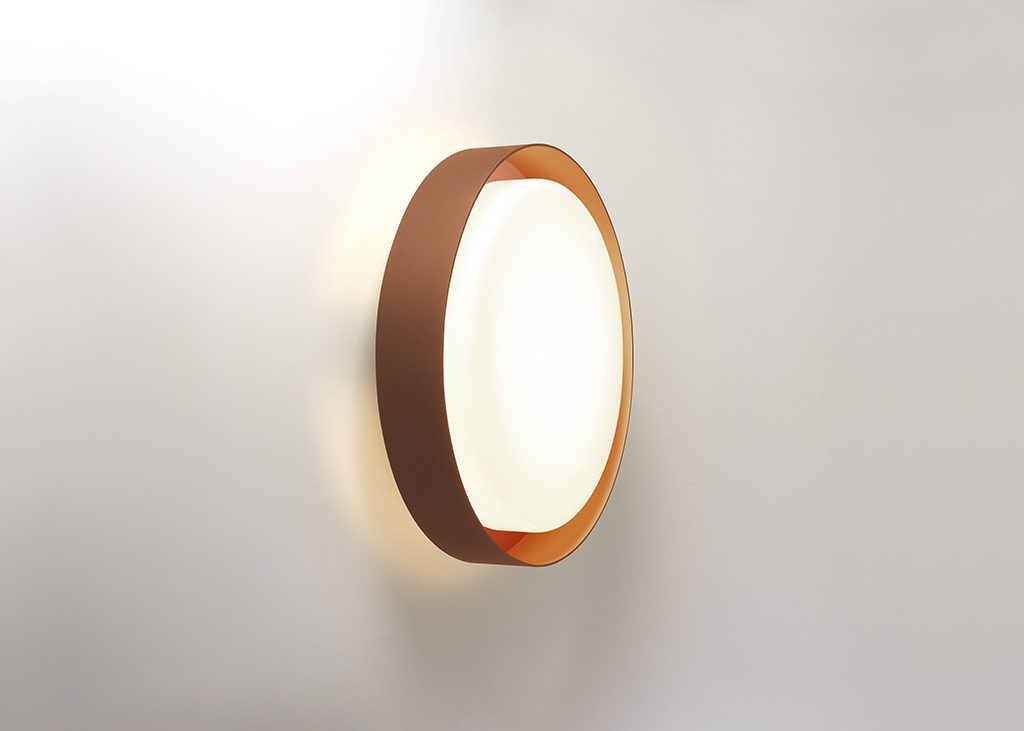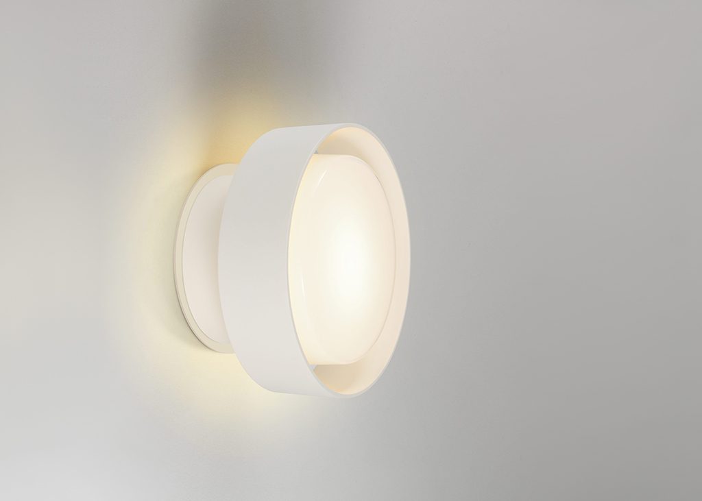 The structure around the diffuser in blown white glass is set slightly apart from the ceiling, and filters the light upwards creating a glowing halo. Available in three diameters, it can also be used as a wall fixture.
