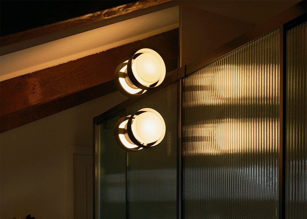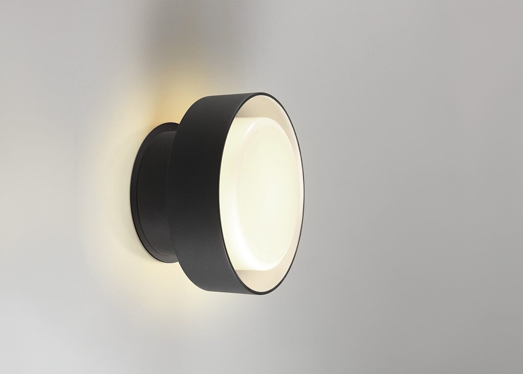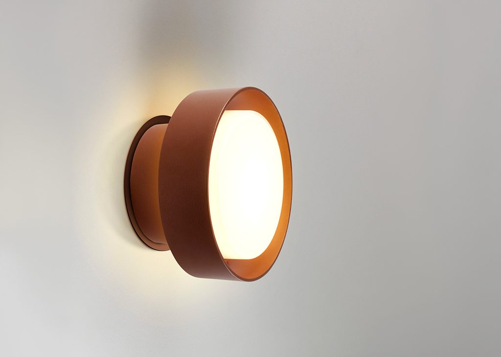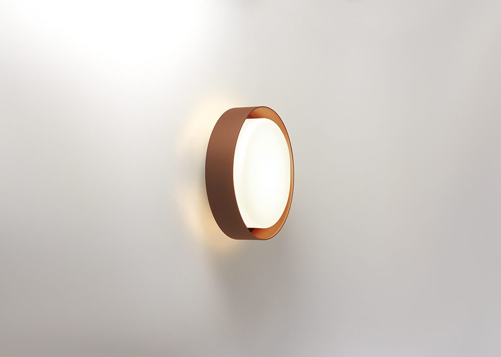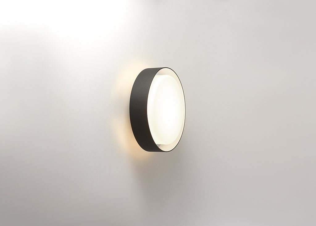 The structure around the diffuser in blown white glass is set slightly apart from the ceiling, and filters the light upwards creating a glowing halo. Available in three diameters, it can also be used as a wall fixture.