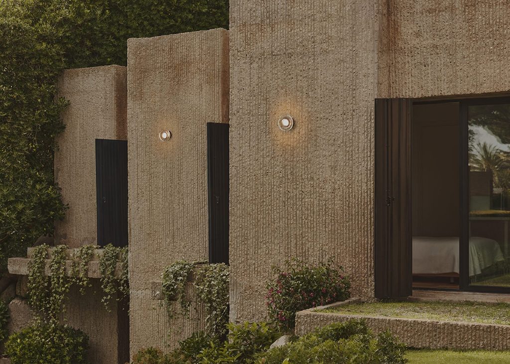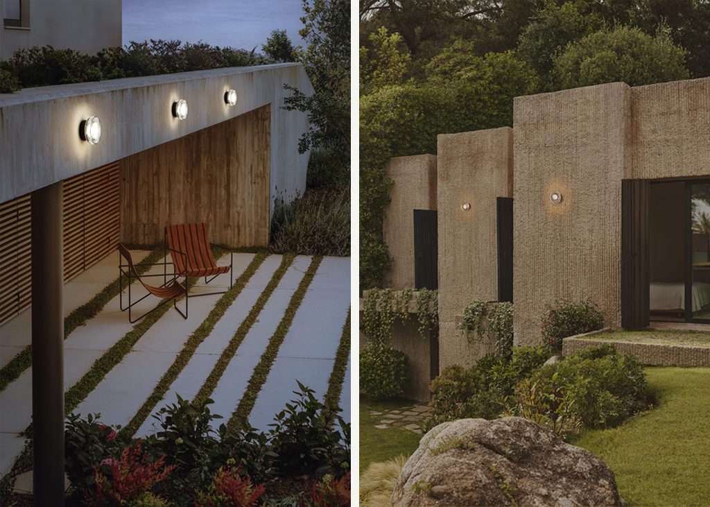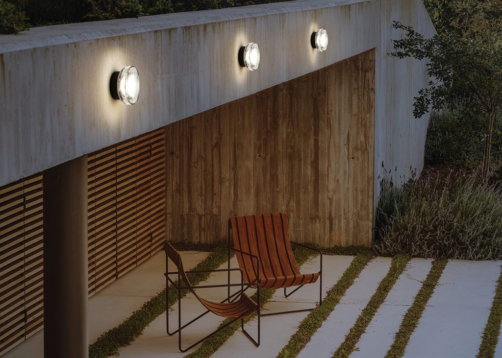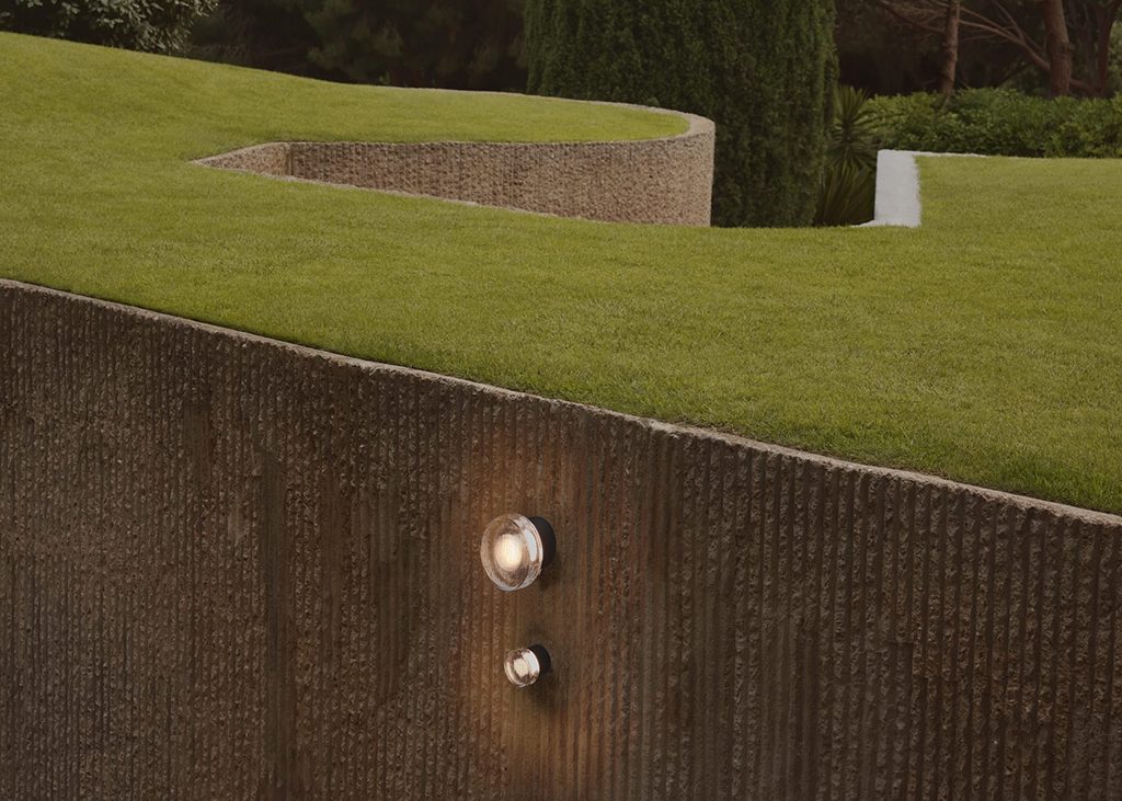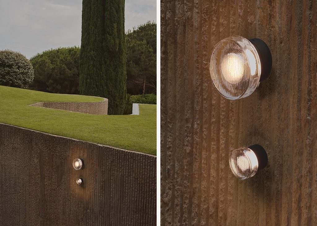 Compact indoor and outdoor wall lamp with a pressed glass diffuser. Its undulating shade covers the light, blurring it. It doesn’t settle for just providing light, it also manages to create an ambiance.
