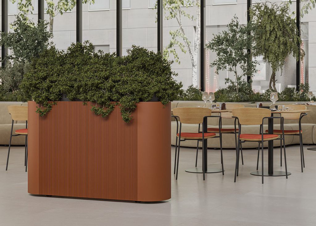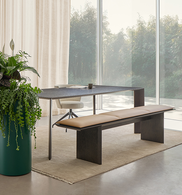 It is an ultra-versatile piece that can be adapted to any interior design project, from living rooms to kitchens, restaurants or offices. The light and thin steel struc- ture contrasts with the wood, acting as a frame. Apart from its aesthetics, its ergonomics have also been worked on, making it comfortable while also being stackable.