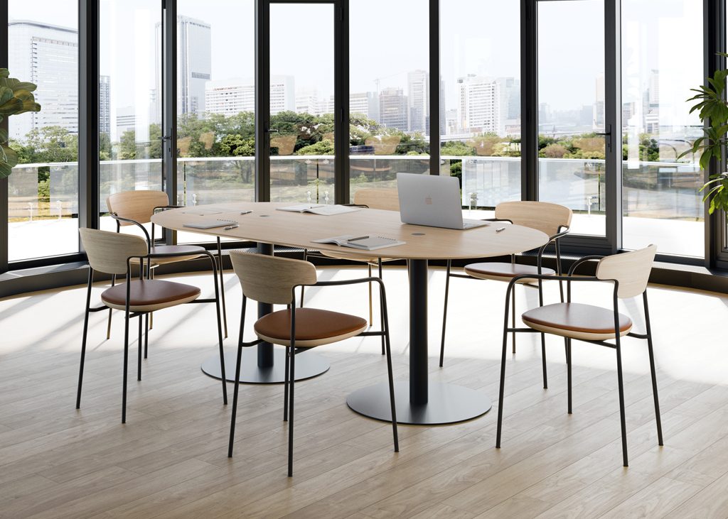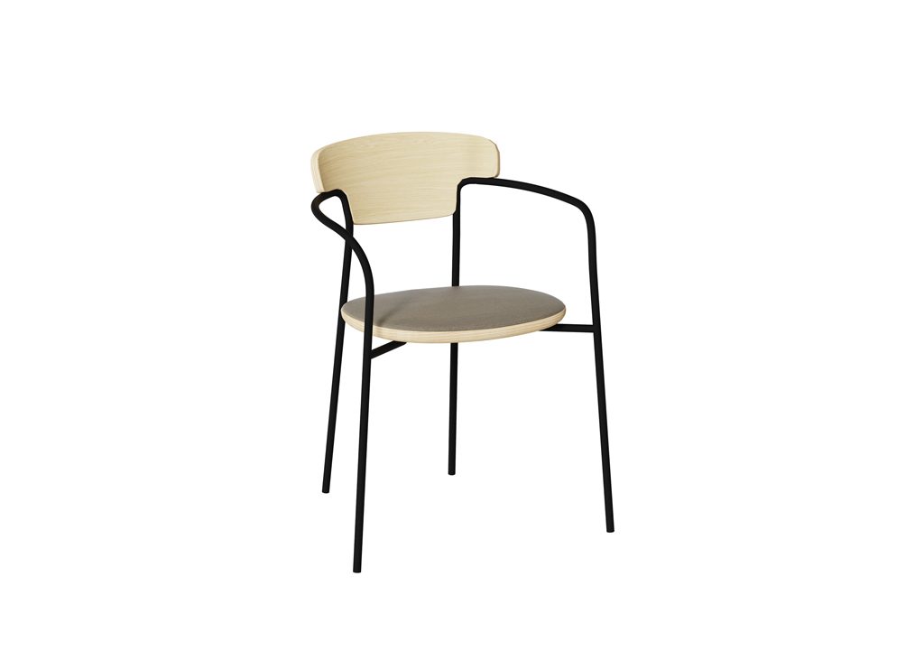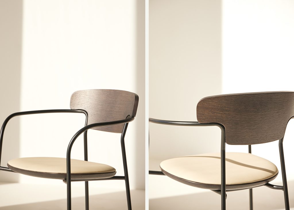 “A line of metal elegantly embraces the chair, from the armrests and around the wooden backrest. The oak seat and backrest contrast with the slim metal tube that characterises the design’s shape”. This is how the designer Sebastian Herkner describes his new Pecan chair for Punt Mobles.