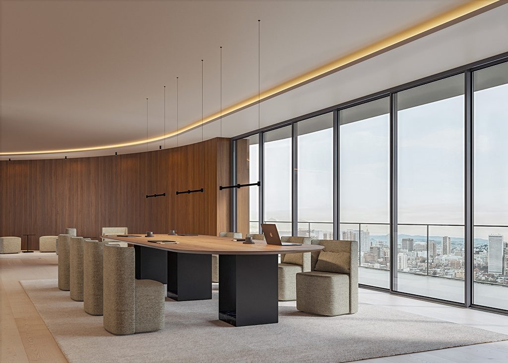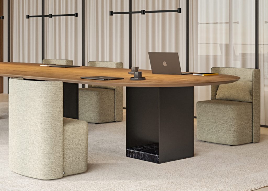 Une tôle pliée enveloppe le marbre situé au pied de la base, laissant un intérieur vide qui apporte une légèreté visuelle et définit son caractère contemporain. Le plateau, fin et minimaliste, semble flotter au-dessus de la structure, tandis que le marbre apporte la gravité nécessaire pour ancrer la pièce.