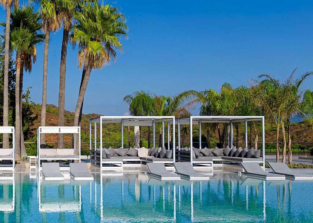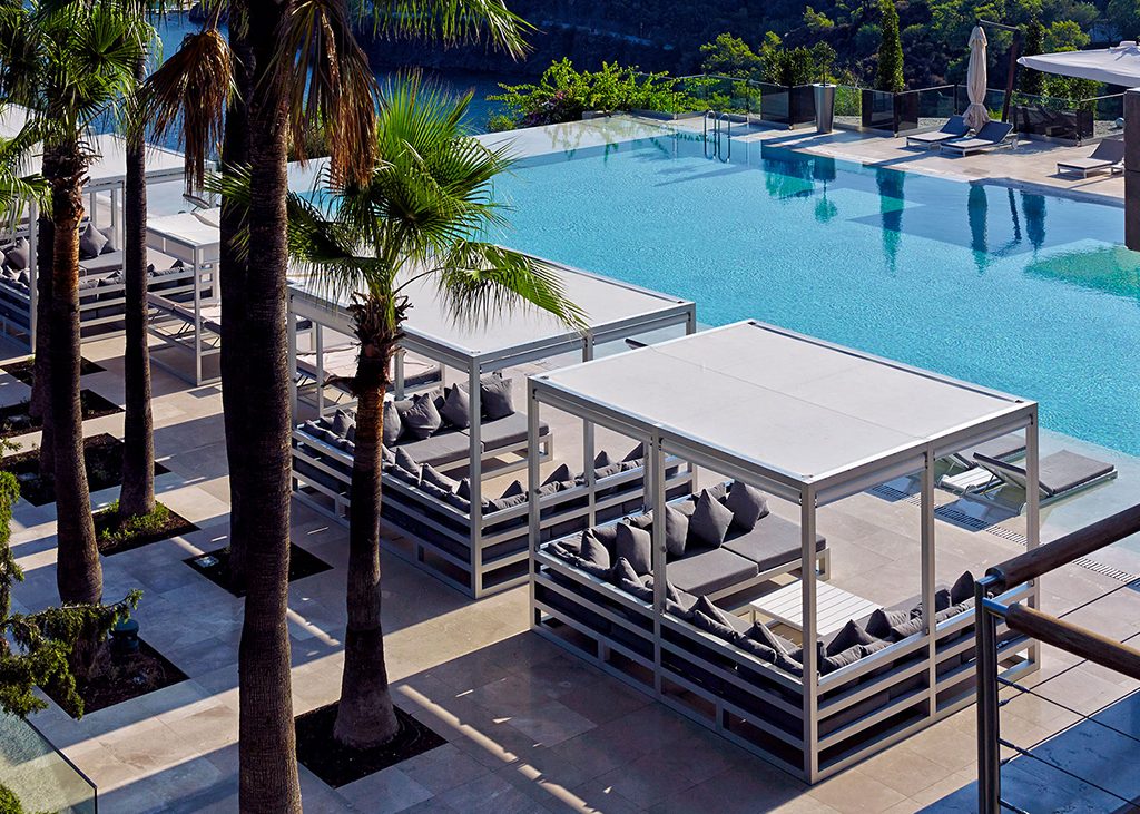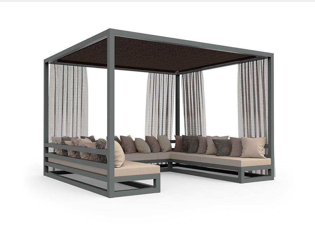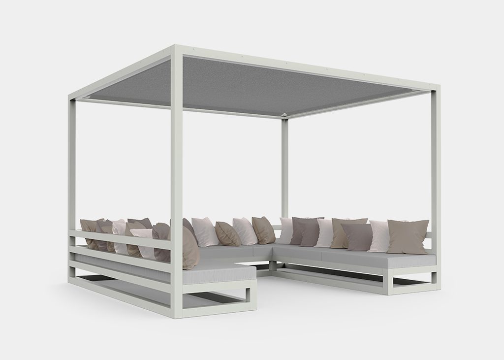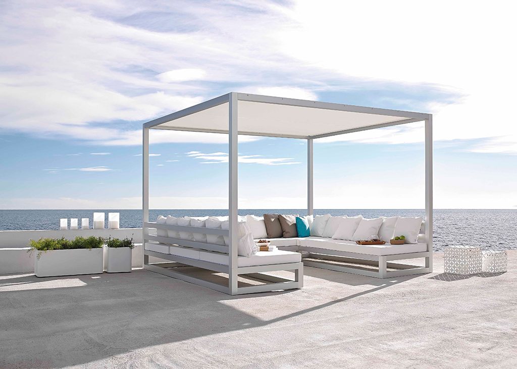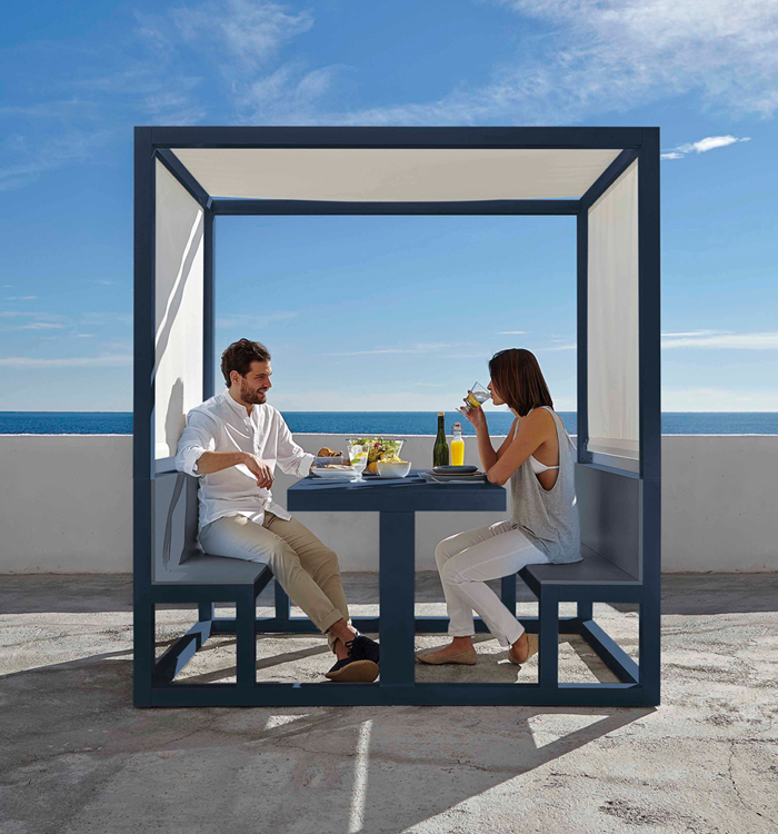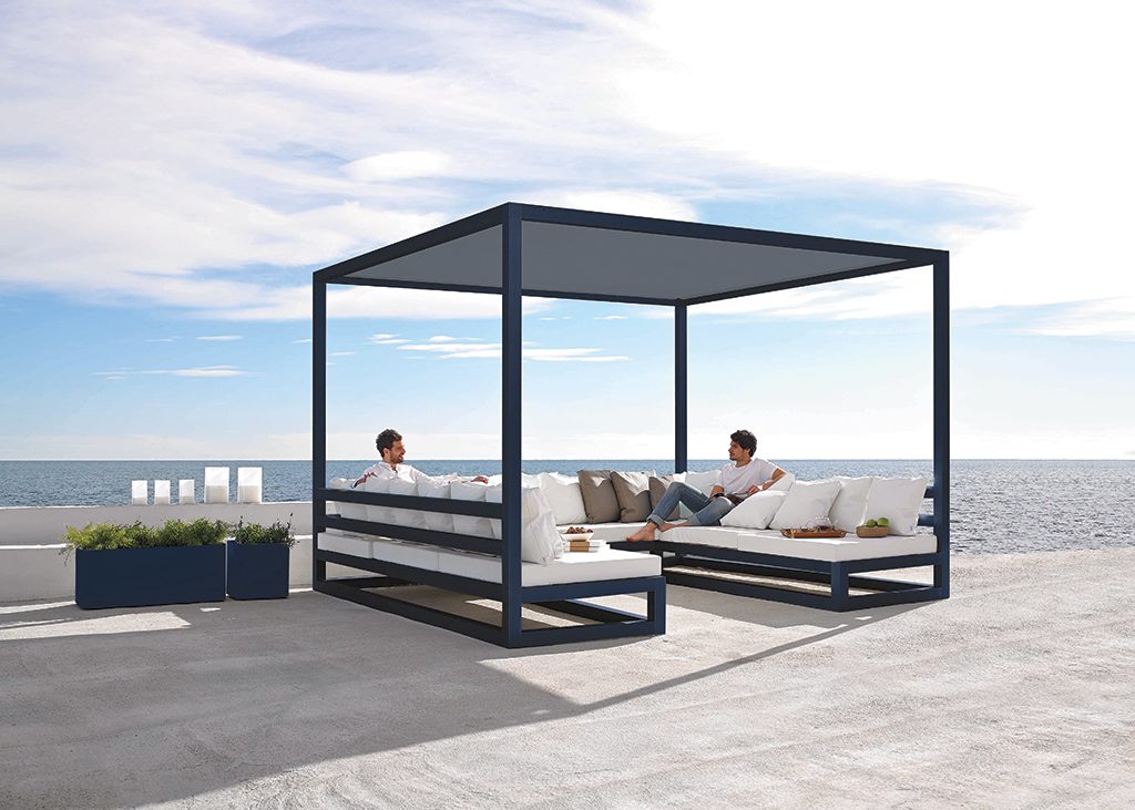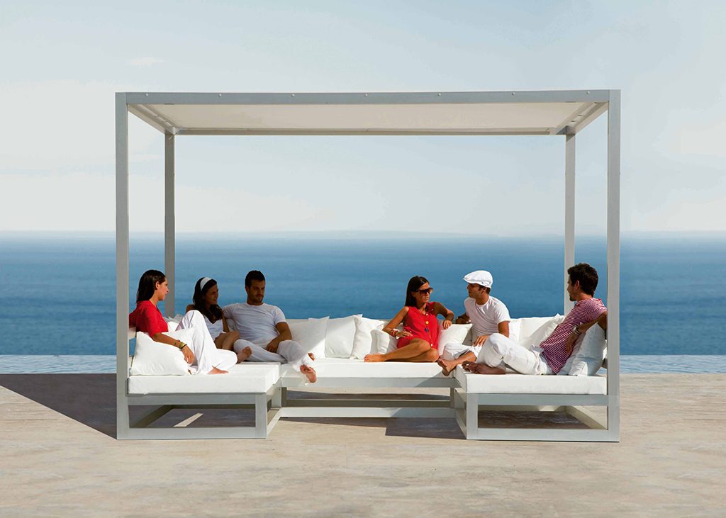 « Un après-midi entre amis sur une plage méditerranéenne, l'endroit idéal pour se détendre sur ce canapé recouvert d'une structure en aluminium et d'un abat-jour en tissu vinyle. »