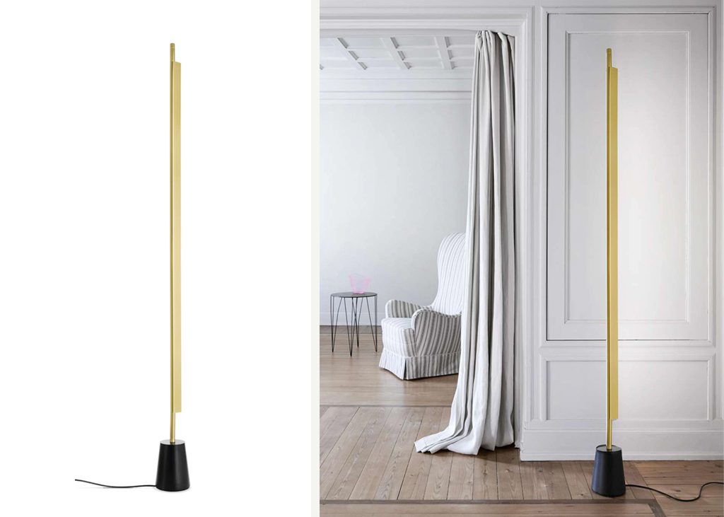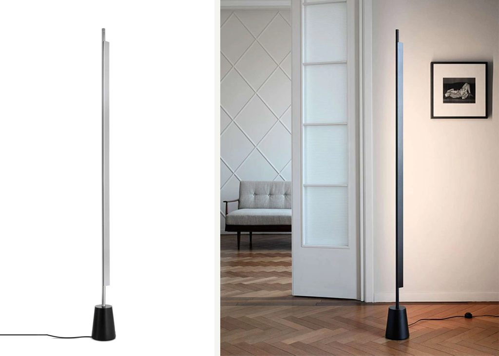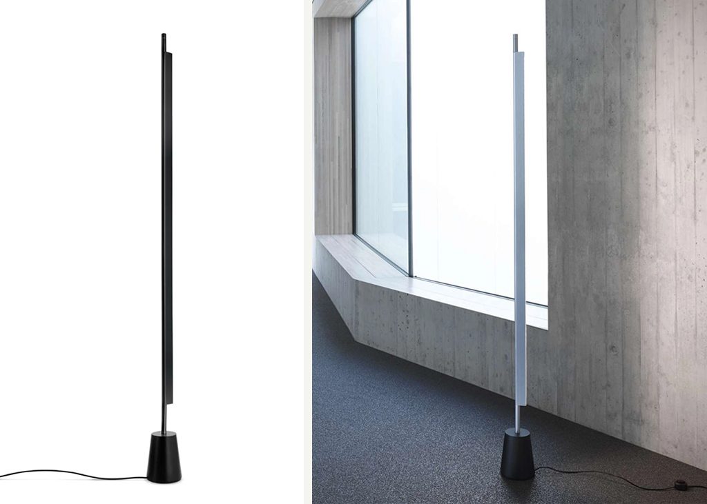 La version lampe au sol de Compendium offre une lumière diffuse. Le corps du luminaire abrite une source LED à haute efficacité et tourne librement sur la base pour diriger la lumière vers le mur, évitant ainsi l'éblouissement direct.