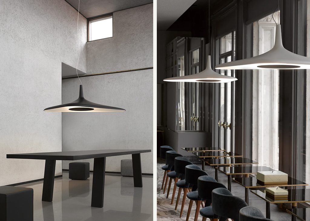 Soutenue par un seul câble asymétrique, la lampe garde son équilibre grâce aux épaisseurs du corps, variant de 8 à 25 mm, offrant un élément lumineux aérien fin qui apporte luminosité avec discrétion et élégance. Un objet qui défie les lois de la physique, grâce à une technologie qui permet une conception à la limite de l'impossible.