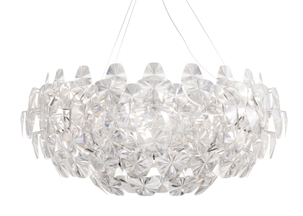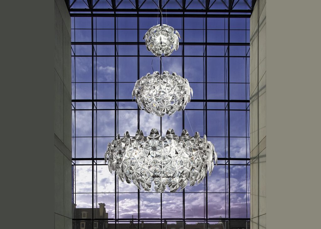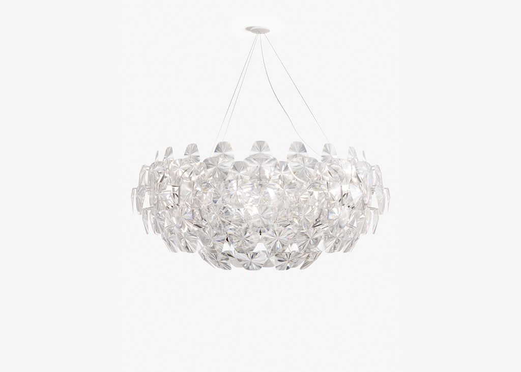 Incroyablement légère et facile à démonter, Hope renoue avec la magie des lustres traditionnels, réinterprétés avec des technologies modernes sophistiquées et des matériaux contemporains. Les fines lentilles Fresnel en polycarbonate multiplient la lumière, créant une atmosphère agréable, pétillante et festive.