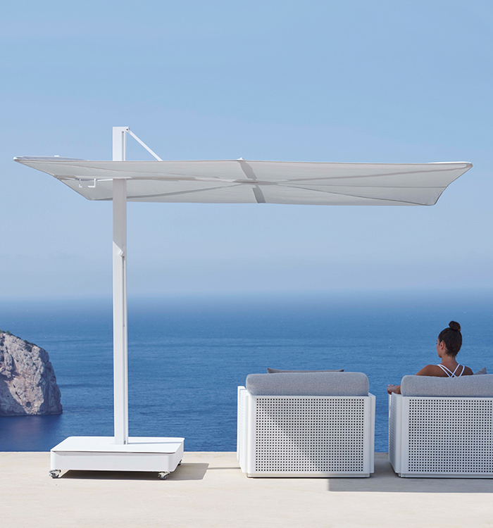 Collection de jardinières en aluminium laqué disponibles en différentes couleurs et tailles. La disposition en ligne de plusieurs jardinière Sonora permet de séparer des zones.