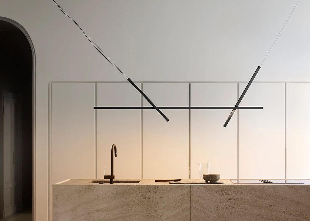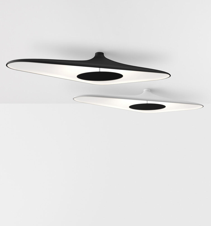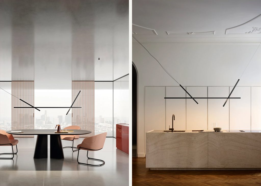 Across est une lampe polyvalente et dynamique, prête à personnaliser n'importe quel espace, en le « traversant » d'un geste graphique clair et distinctif. Une suspension linéaire composée de trois axes interconnectés de deux tailles différentes, pour créer des compositions aux images et aux niveaux de complexité variés. La structure est formée d'un corps extrudé horizontal qui contient un groupe optique pour l'éclairage direct, et de deux éléments articulés qui permettent de fixer la lampe au sol ou au plafond.
