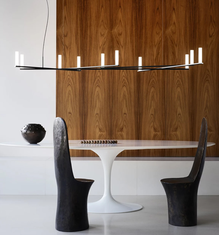 Le passage du courant à l'intérieur des bras est transmis jusqu'aux extrémités, où les sources lumineuses LED sont mises en valeur par un diffuseur réalisé à partir d'un papier sophistiqué à base d'un mélange de cellulose et de fibres synthétiques.