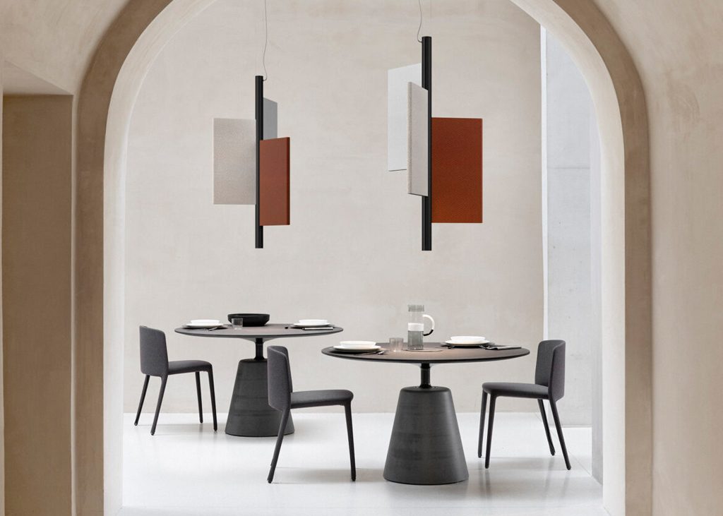 Trypta est un système de lampes à suspension qui offre une combinaison de caractéristiques acoustiques et de performances d'éclairage dans différentes dimensions et couleurs. Le corps cylindrique en aluminium est équipé de deux sources LED pour fournir une lumière diffuse directe et indirecte.