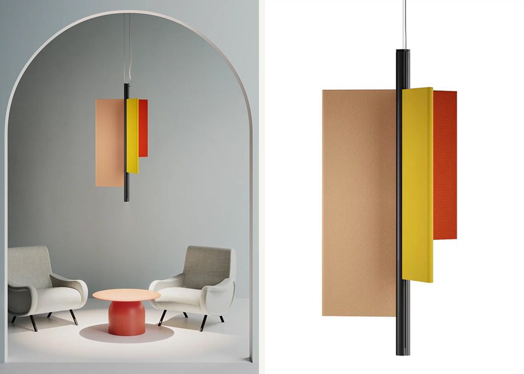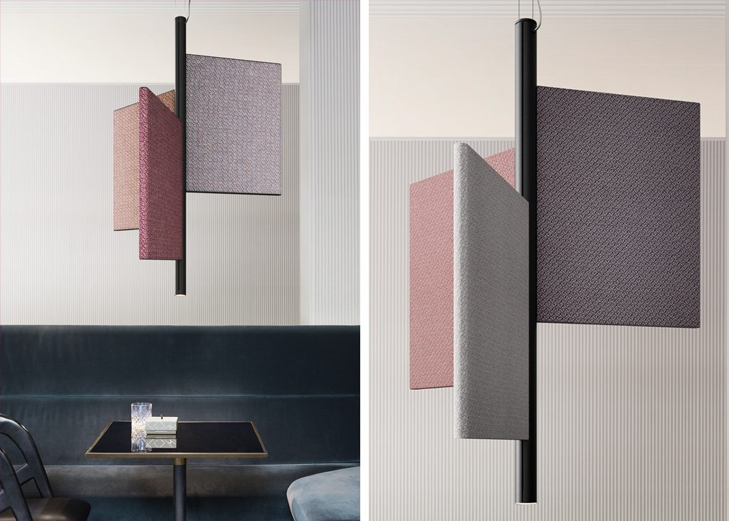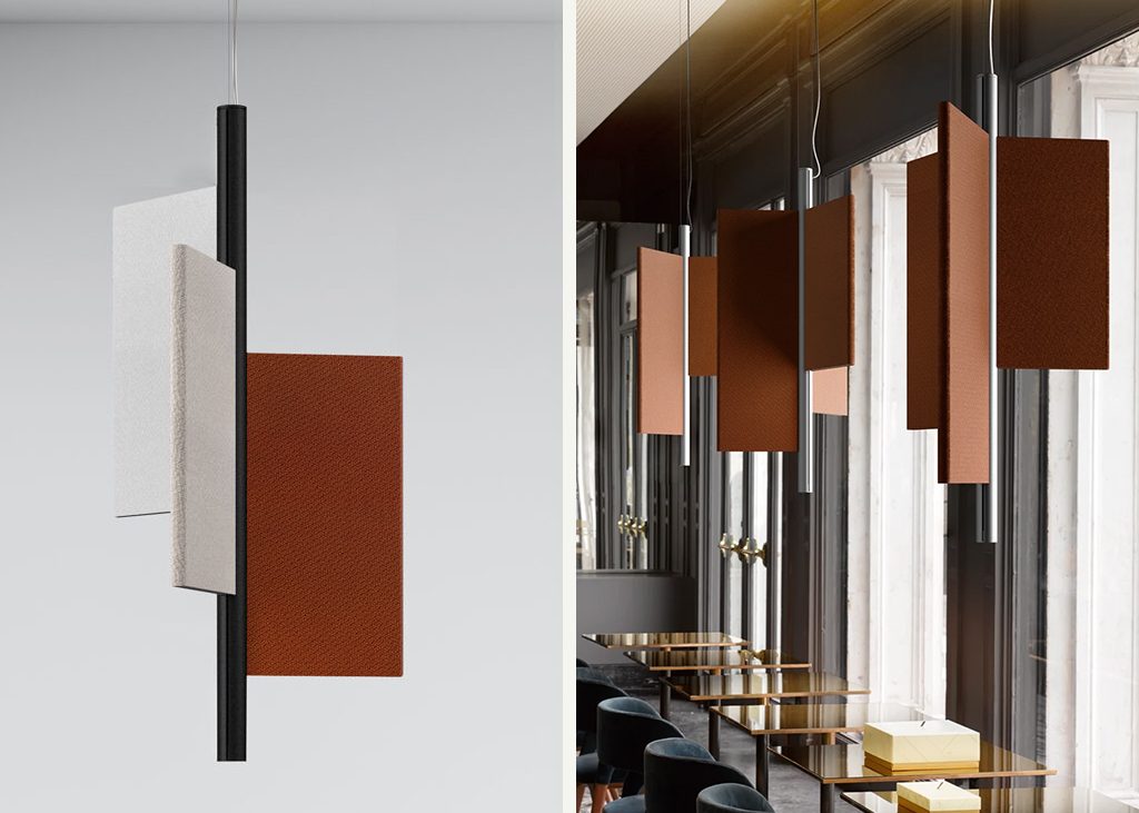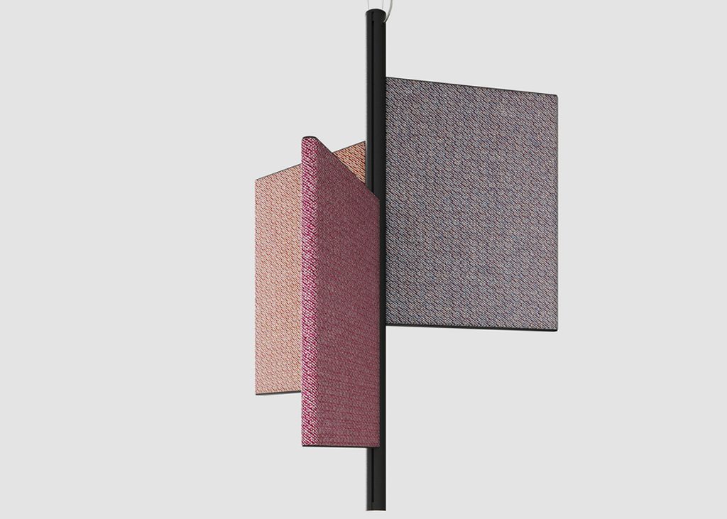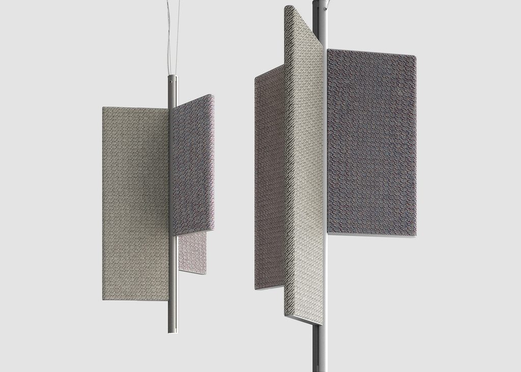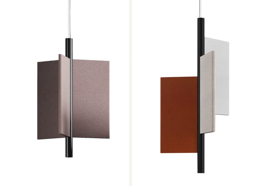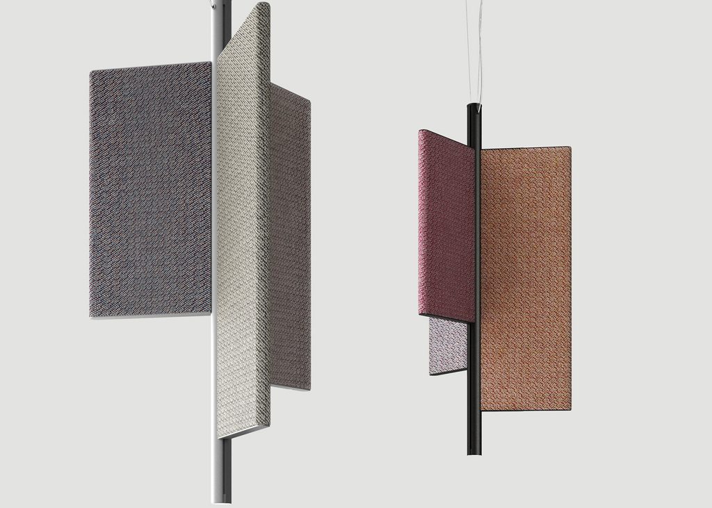 Trois fentes le long du corps de la lampe permettent l'assemblage de trois panneaux acoustiques positionnés à 120°. Le noyau des panneaux est fait d'un matériau insonorisant haute performance, recouvert d'un tissu élégant offert en différentes couleurs.