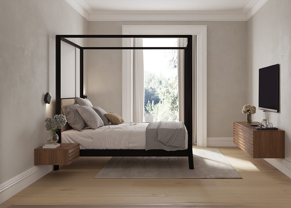Une collection de buffets et meubles de télévision au design original, avec des lames en partie frontale qui masquent les divisions et servent à la fois de poignées aux portes et tiroirs. Le meuble repose sur un socle, avec des pieds réglables ou avec une ferrure murale optionnelle. Les éléments de porte incluent des étagères réglables en hauteur.